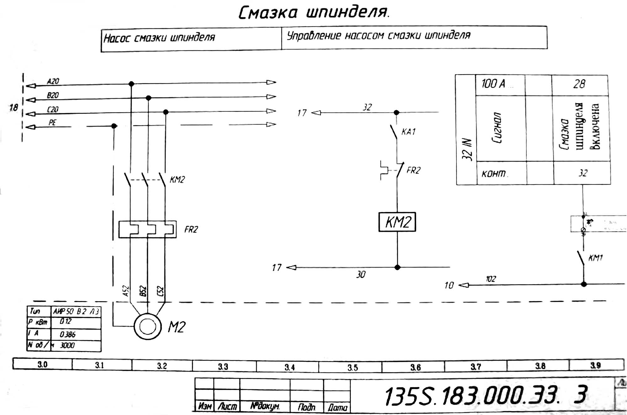 Увімкнення насоса осуществляется при включении приводу шпинделя контактом реле KAI. Включенное состояние контролируется посредством сигнала в ПК от пускателя КМ2. При перегреве двигуна блокируется увімкнення головного привода.