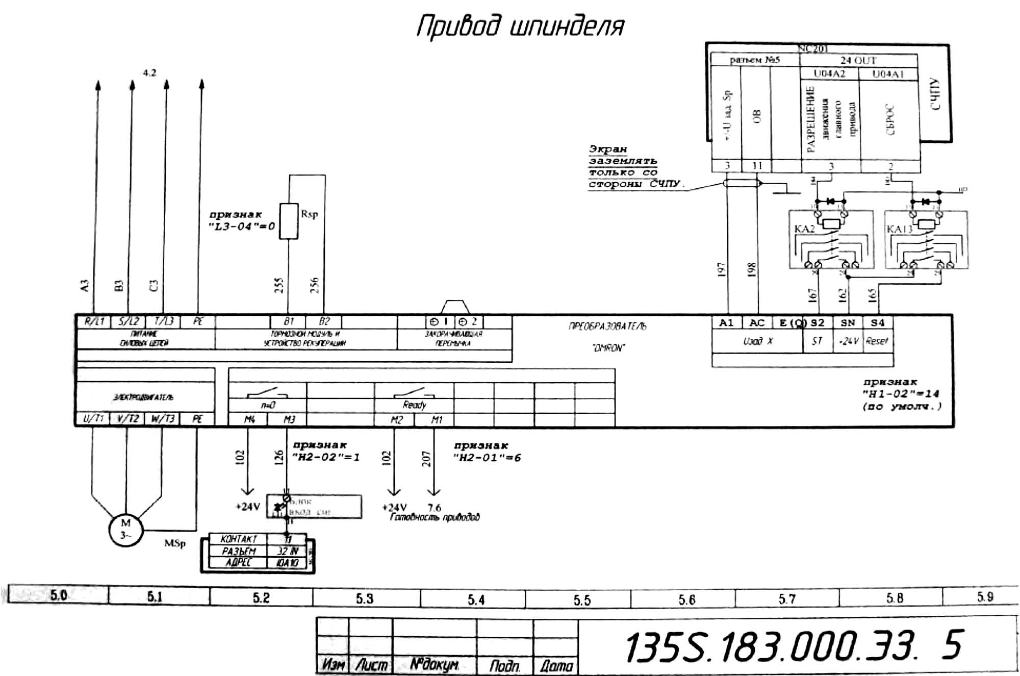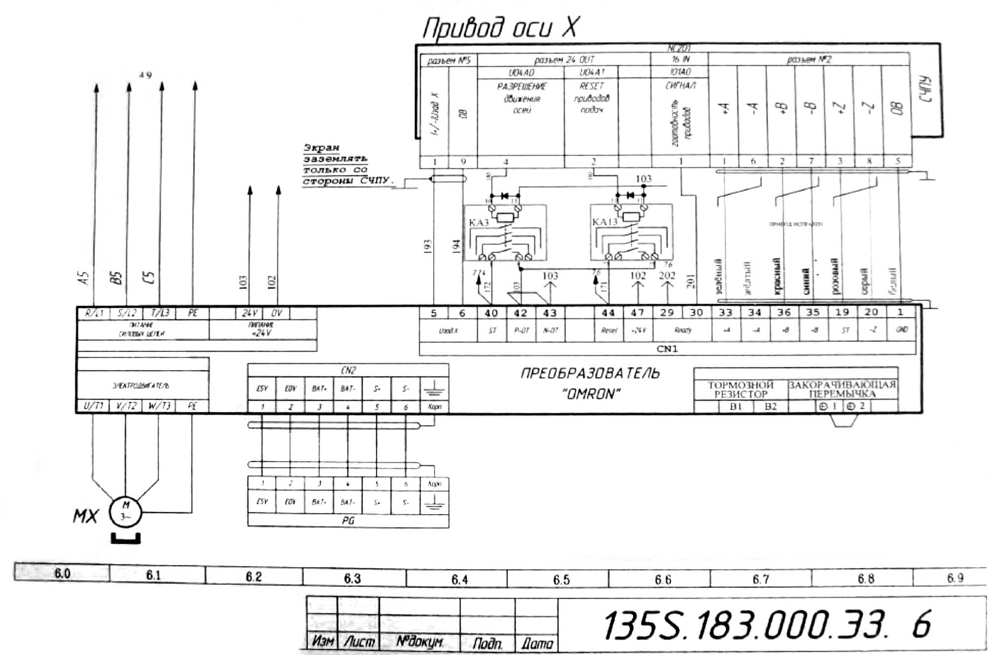 При включении верстата включаются пускатели КМ1, подающие напряжение на преобразователь A3 і А4 через тепловые автоматы QF8, QF9. Состояние і режими роботи преобразователя определяются посредством входных і выходных сигналов. При получении обратного сигнала от приводов «ГОТОВНОСТЬ» УЧПУ включает реле КА3, з которого подается сигнал «разрешение движением приводам обоих осей». Керування скоростью і направлением обертання осуществляется величиной і полярностью потенциальных сигналов от УЧПУ. Информация о положения координат поступает в УЧПУ от датчиков положения типа ЭНКОДЕР вмонтированных в двигатели осей Омрон.