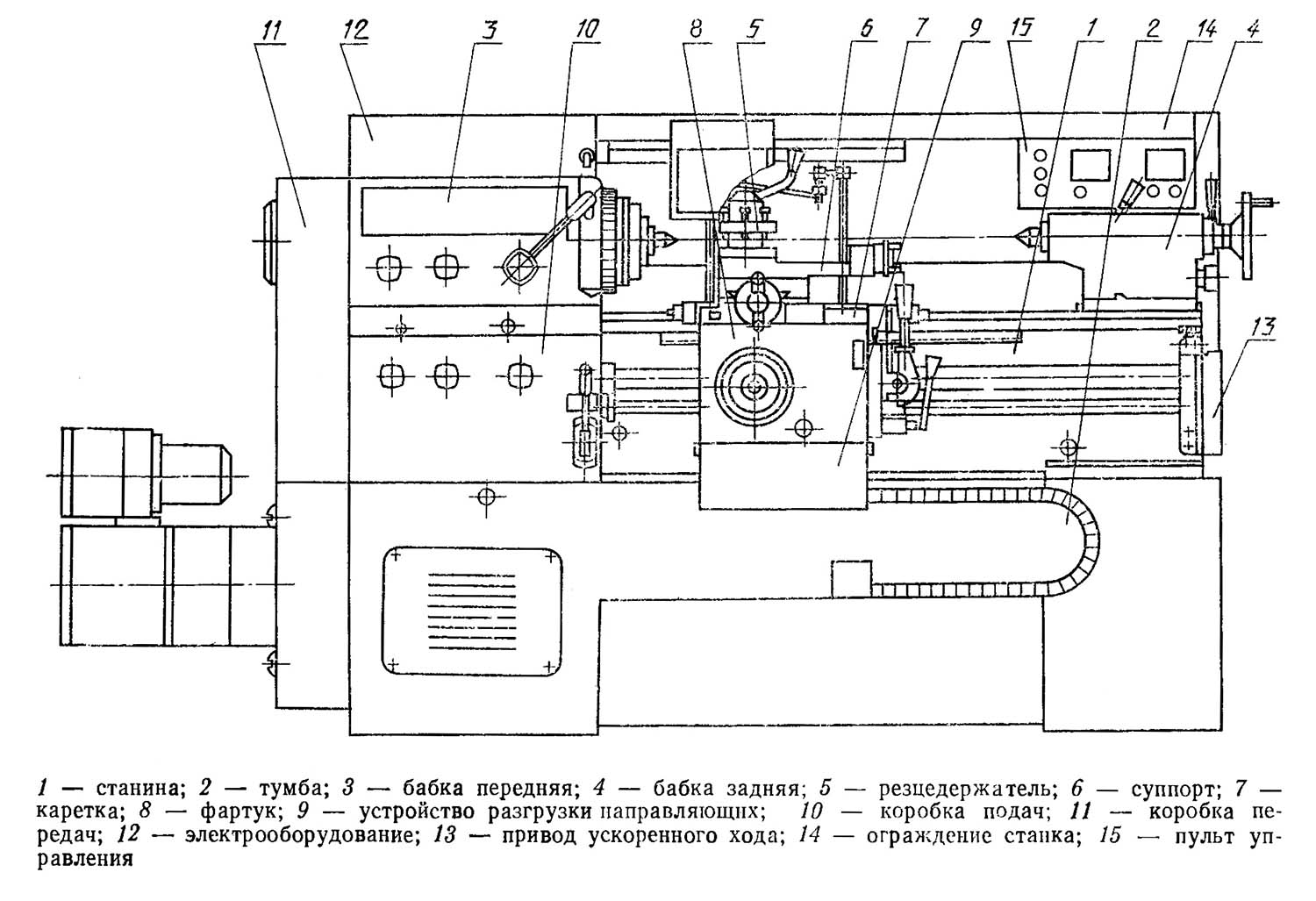 Розташування основних вузлів токарно-гвинторізного верстата 16Д16АФ1