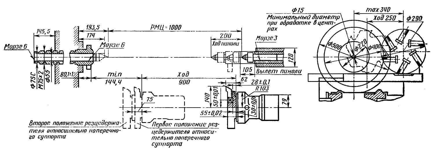 Фланцевий кінець шпинделя виконаний за ГОСТ 12593 (DIN 55027, ІСО 702-3-75) під поворотну шайбу, з центруючим коротким конусом 1:4 (7°7′30″), номінальний діаметр конуса D = 106,375 мм, умовний розмір – 6. Внутрішній (інструментальний) конус шпинделя – Морзе 6. Стандартний діаметр токарного патрона 200, 250 мм.
