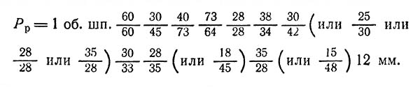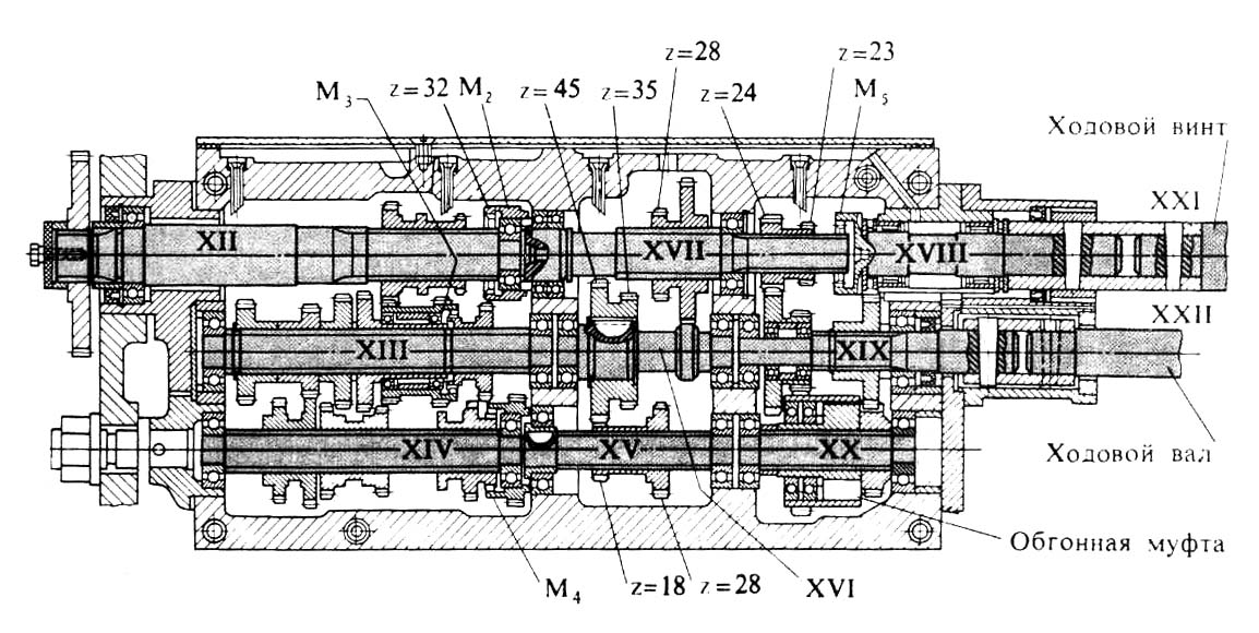Механізм реверса обеспечивает правое вращение ходового гвинта через пару z = 30/45, левое — через передачу z = 30/25·25/45.