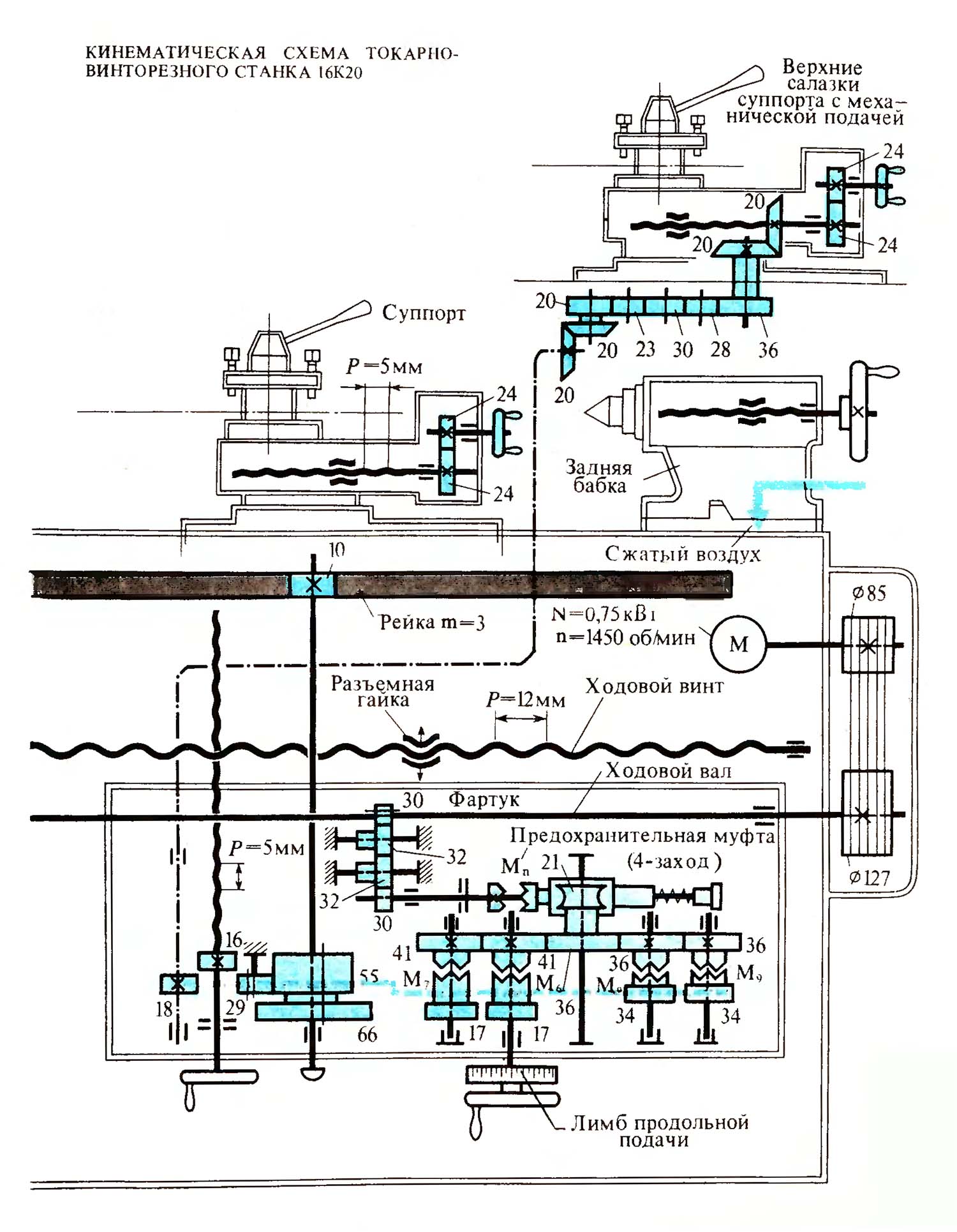 Кінематична схема верстата 16к20 наведена для розуміння зв'язків та взаємодії основних елементів верстата. На виносках проставлені числа зубів (z) шестерень (зірочкою позначено кількість заходів черв'яка).