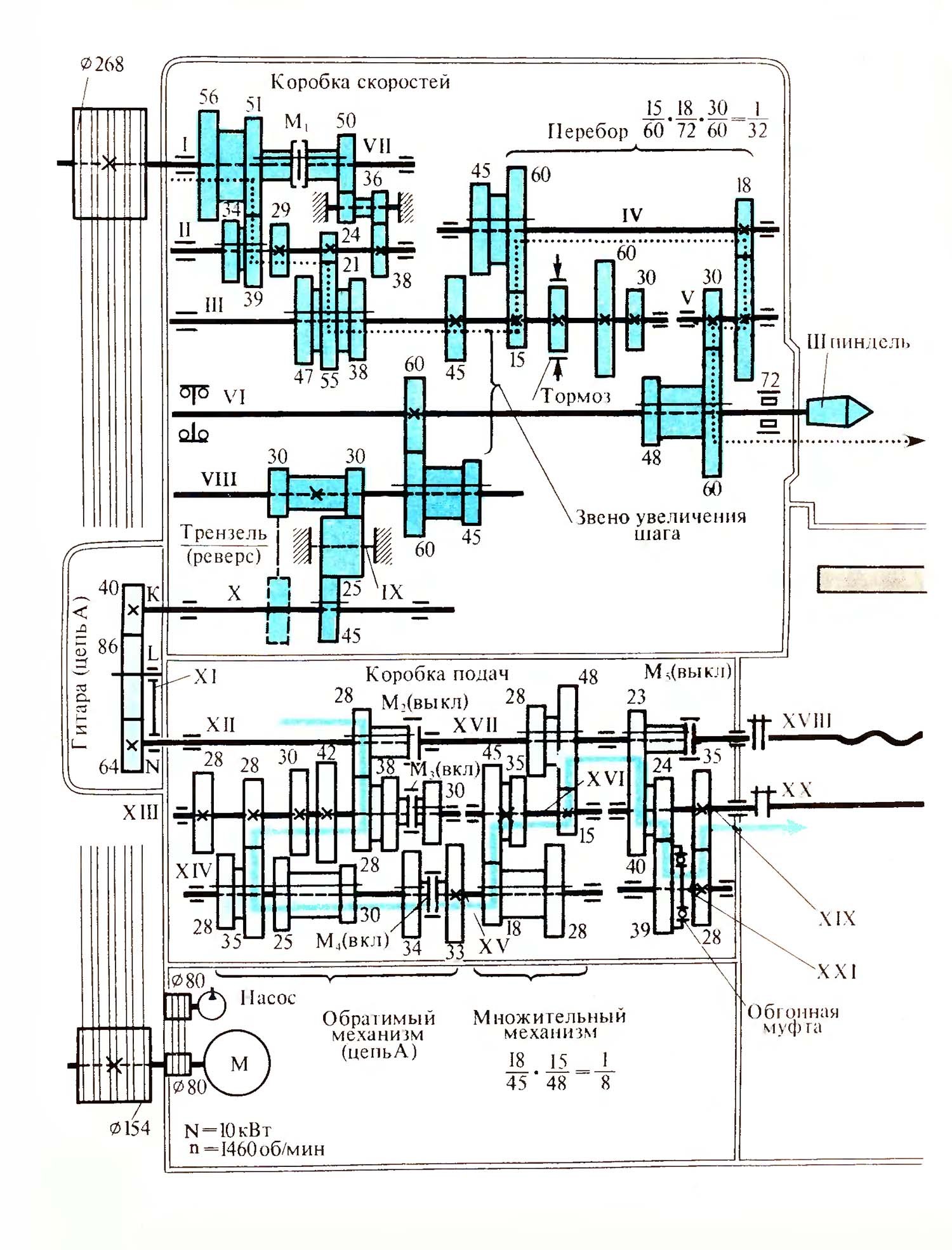 В случае нарізання точных різьб вращение може быть передано от гітари сменных колес непосредственно на ходовой винт з шагом t = 12 мм через валы XII, XVII, XXIII при включенных зубчатых муфтах М2 і М5, минуя механізм коробки подач.