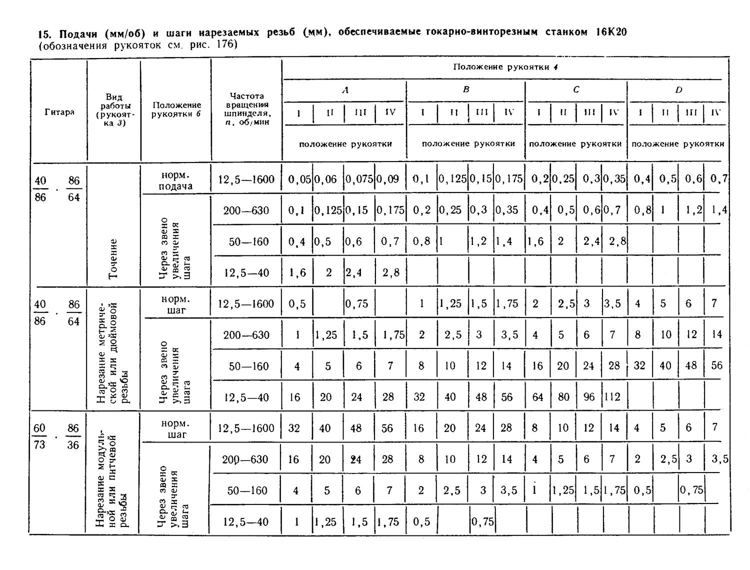 Таблиця подач і шагов нарезаемой різьби верстата 16к20