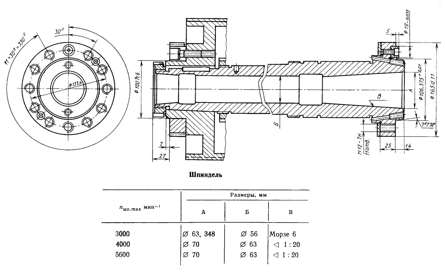 Шпиндель напівавтомата в залежності від виконання базується на підшипниках високої точності (роликових конічних або кулькових радіально-упорних типу «дуплекс» та «триплекс») це дозволяє отримати високу точність форми відпрацьованих деталей.