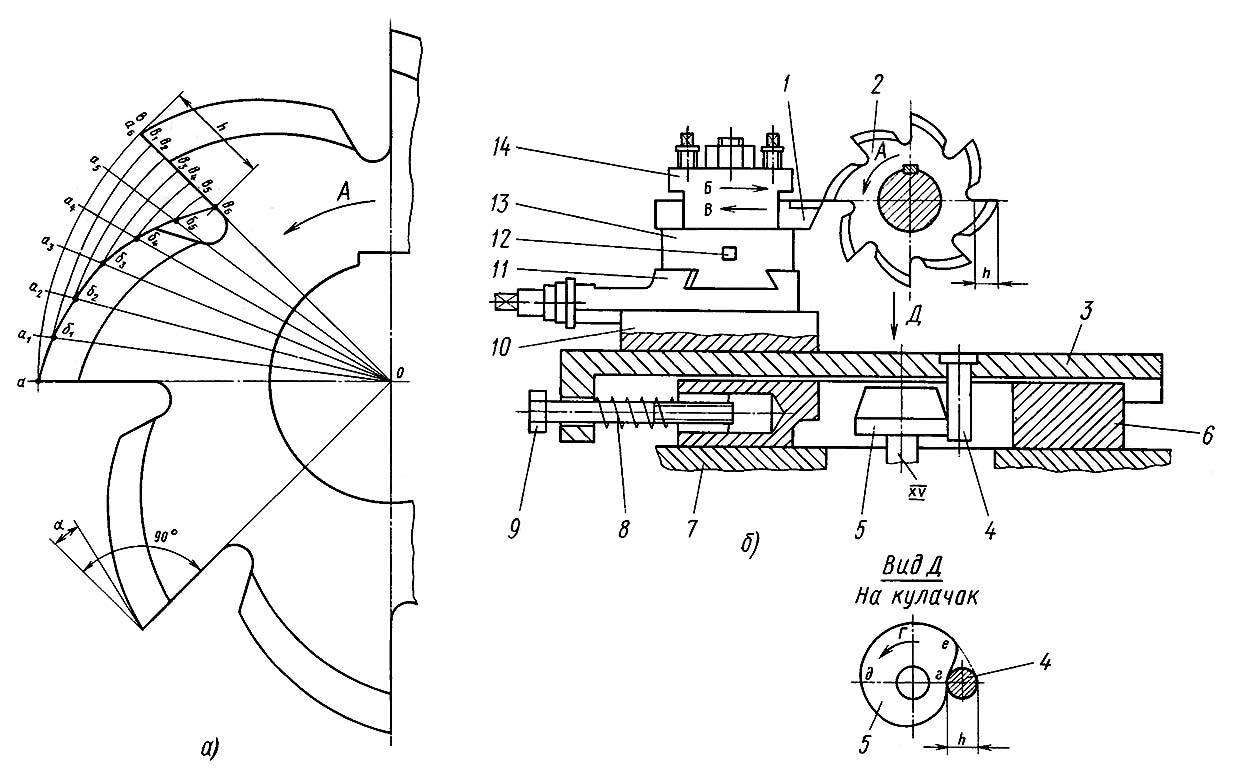 Палець 4, закріплений на санках 3, ковзає по профілю кулачка і переміщає в напрямку стрілки Б санки 3 і супорт з різцем 1, при цьому відбувається затилування зуба фрези 2 за профілем а-б5 (див. рис. 4, а), санки 3 (див. рис. 4 б) і супорт після закінчення обробки зуба під дією пружини 8 переміщуються в напрямку стрілки, різець 1 відводиться назад.