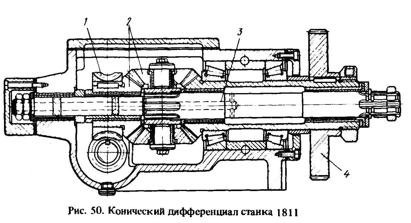 При потиливанні циліндричних фрез зі спіральними стружковими канавками і черв'ячними фрезами необхідно диференціальний рух, який забезпечує додатковий поворот кулачка потиличних, що в свою чергу призводить до додаткового переміщення різця в радіальному напрямку при поздовжньому переміщенні каретки супорта. Для підсумовування двох рухів на кулачці потиличних використовується конічний диференціал (рис. 50). Він складається з чотирьох конічних зубчастих коліс 2 з числом зубів z = 25. Сателіти конічного диференціала жорстко пов'язані із злом 3 гітари потиличних, а черв'ячне колесо 1, до якого приходить рух від гітари диференціала, з лівим конічним колесом. Сума рухів, що передається кулачку потиличних, знімається з правого конічного колеса, що сидить жорстко на одній втулці з колесом 4. Механізм диференціала вміщений у закритому чавунному корпусі та встановлений на лівому торці станини.
