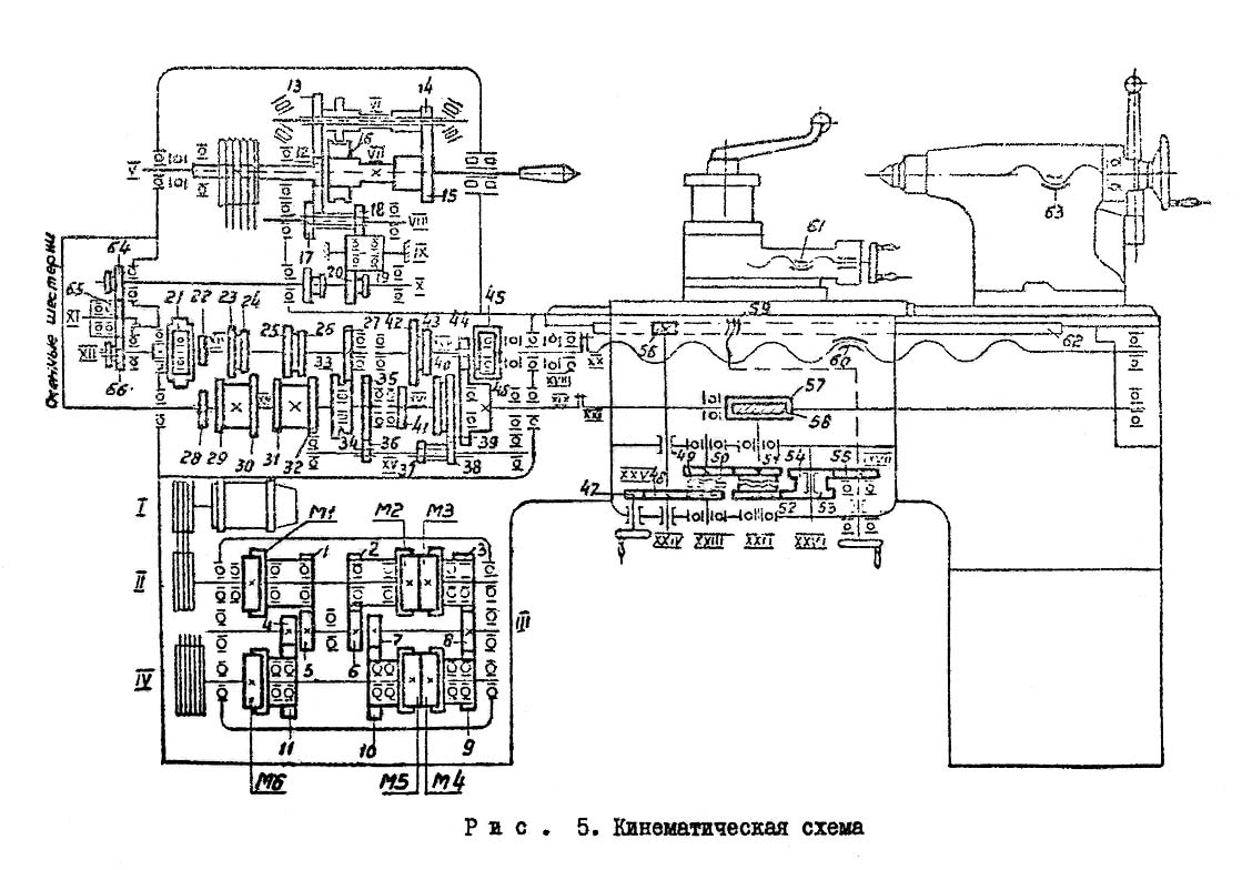 Когда нарезаются дюймовые і питчевые різьби (как показано на схеме), кулачковая муфта М2 выключена. Колесо 51 зацеплено з шестерней 30 вала XII, а шестерня 39 на валу XV введена в зацепление з шестерней 39 двойного блока 22, 39, свободно сидящего на валу XIV. Для нарізання метрических і модульных різьб включается муфта М2, колесо 51 выводится из зацепления, а шестерня 39 перемещается по валу XV вправо до зацепления з колесом 39, жестко закрепленным на валу XIV.