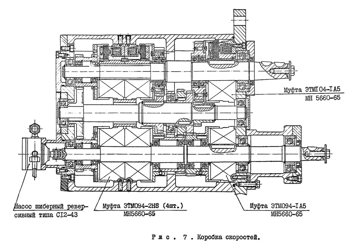 Широкая паразитная шестерня 22 реверсивного механізма смонтирована на оси 21 на шарикопідшипниках. Подвижная шестерня 24 реверса і насос 23 установлены на валу 26.