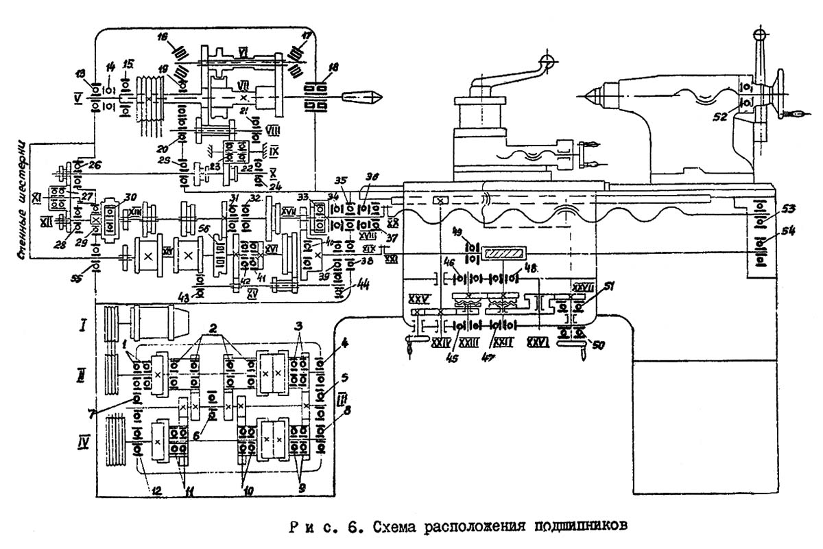 Промежуточный вал XIX і связанный з ним предохранительной муфтой Мn ходовой валик XXI получают вращение от выходного вала XVII коробки подач через колеса 23—55. Ходовой валик XXI передает вращение посредством червячной передачи 2—35 валу XXII. Последний связан з валом XXIII колесами 31—53.