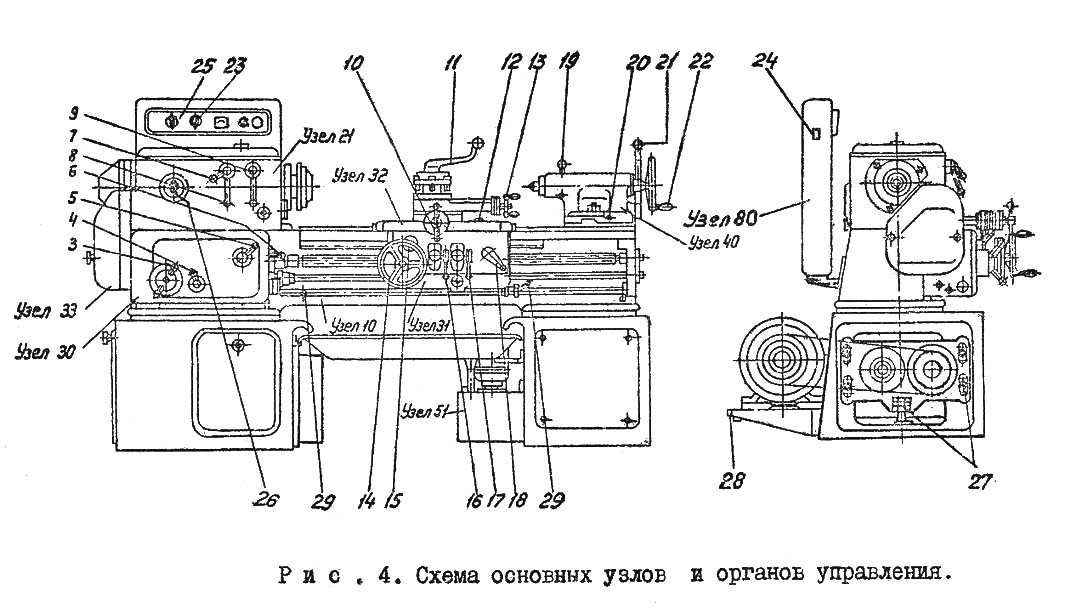 Быстрый отвод і подвод суппорта в пределах до 8 мм, необходимый при нарезании різьби і ряде других операций, производится рукояткой 23.