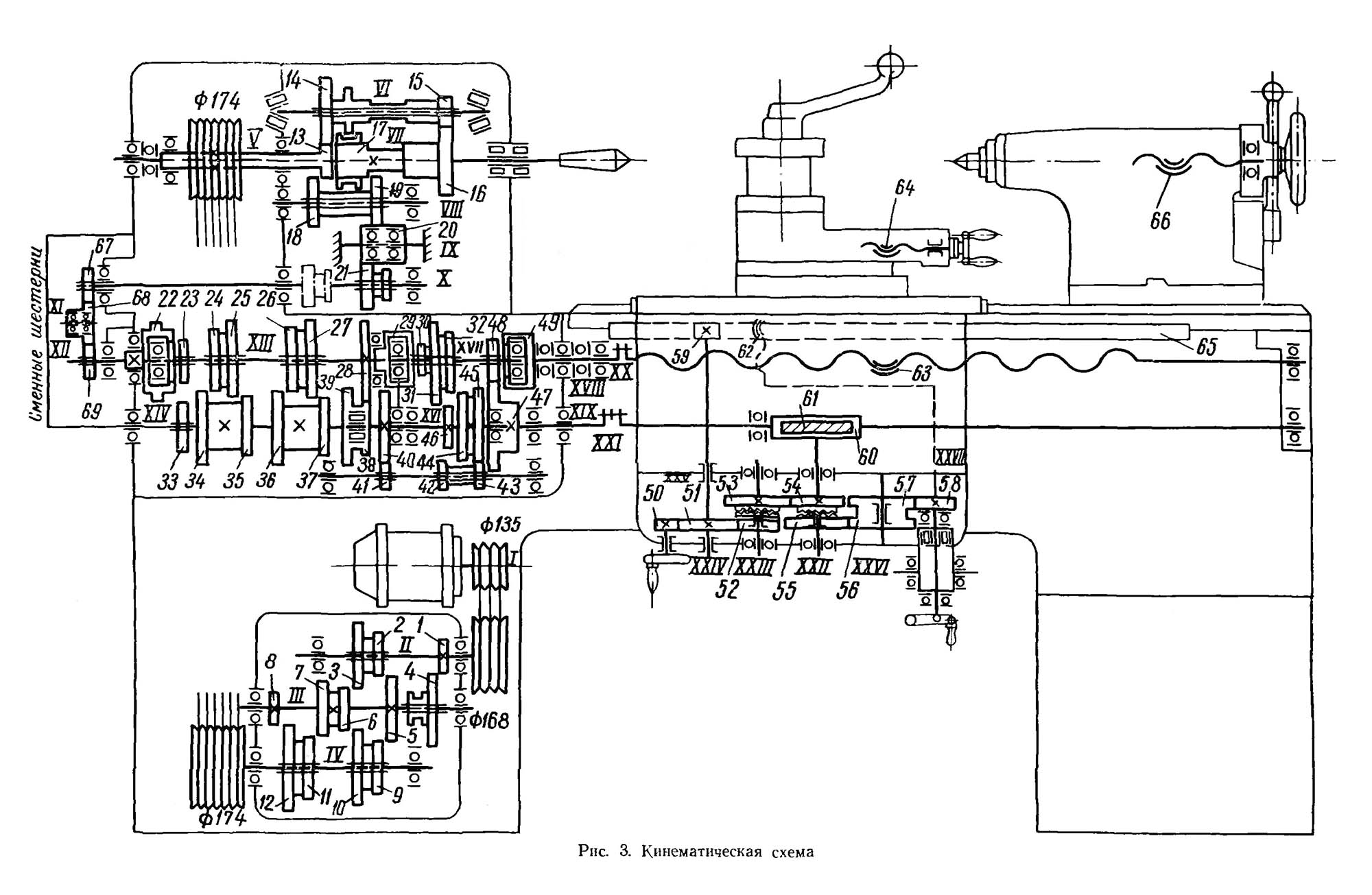 Когда нарезаются дюймовые і питчевые різьби (как показано на схеме), кулачковая муфта М2 выключена. Колесо 51 зацеплено з шестерней 30 вала XII, а шестерня 39 на валу XV введена в зацепление з шестерней 39 двойного блока 22—39, свободно сидящего на валу XIV. Для нарізання метрических і модульных різьб включается муфта М2, колесо 51 выводится из зацепления, а шестерня 39 перемещается по валу XV вправо до зацепления з колесом 39, жестко закрепленным на валу XIV Суппорт получает рух от коробки подач через кулачковую муфту М4, промежуточный валик XVIII і ходовой винт XX.