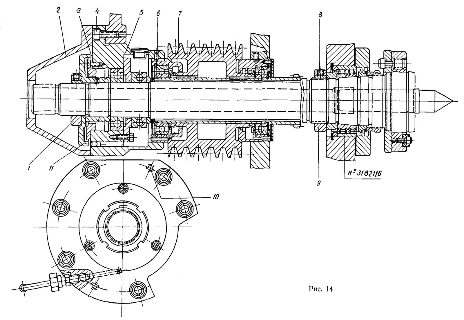 Задня опора шпинделя состоит из радиально-упорного шарикопідшипника 6 серии 46211А і шарикового упорного підшипника 7 серии 8211А. Регулювання задньої опори производится гайкой 2. Шпиндель 18 Верстата моделі 1А616П имеет фланцевый передний конец з коническим центрирующим буртиком, выполненным по ГОСТу 2570—58 і обеспечивающим быстросменность установки патронов і надежность их крепления. Приводной шкив 9 закреплен на полом валу 10, который смонтирован на независимых от шпинделя шарикопідшипниках 8. Такой монтаж приводного пристроя разгружает шпиндель от изгибающих усилий со стороны клиноременной передачи і ведущей шестерни г перебора, изготовленной за одно целое з полым валом 10. Конструкція задньої опори шпинделя позволяет устанавливать і заменять приводные ремни без демонтажу шпинделя. Для етого снимают защитный кожух 3, отворачивают гайку 2, отвинчивают фланец 4 і з помощью отжимных болтов выпрессовывают буксу 5 из корпуса 1 бабки. В образовавшееся отверстие заводят клиновые ремни для их монтажа или смены