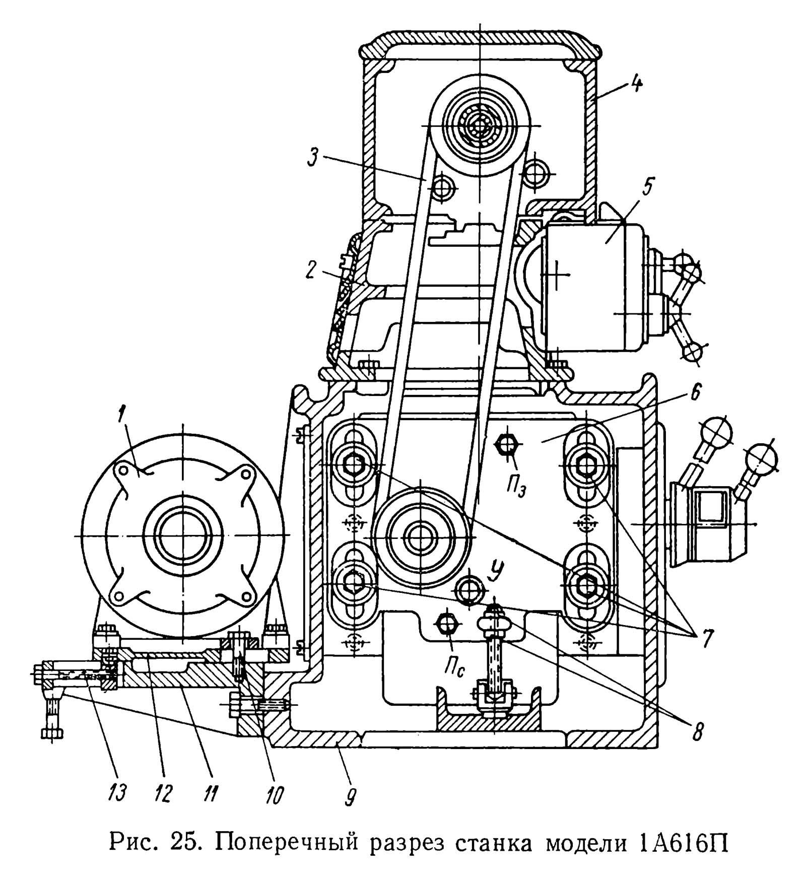 Главный електродвигатель 1 установлен на плите 12, которая може перемещаться в горизонтальной плоскости по кронштейну 11. Последний закреплен на задньої стороне тумбы 9. Для регулювання натяжения ремней, связывающих електродвигатель з коробкой швидкостей, следует освободить болты 10 і вращением винтов 13 создать необходимое натяжение, після чего вновь закрепить болты 10. Станина 2 коробчатой формы з П-образными поперечными ребрами имеет две призматические і две плоские направляющие. Коробка подач 5 крепится к станине 2 з лицевой стороны.