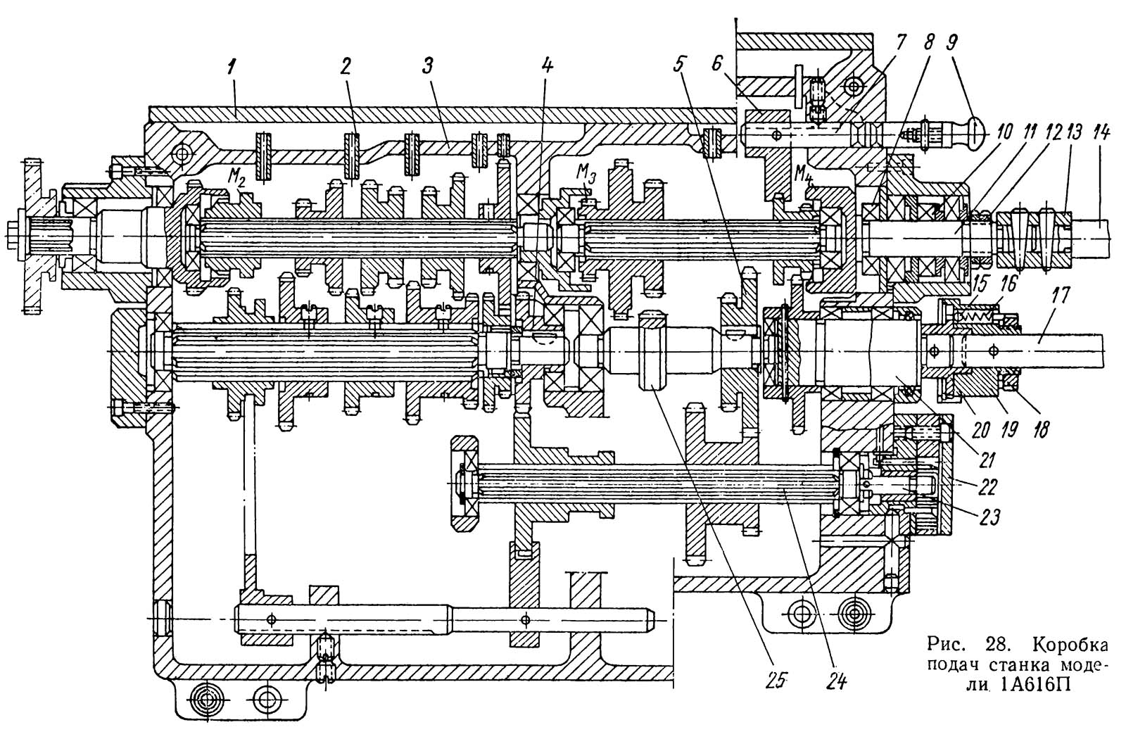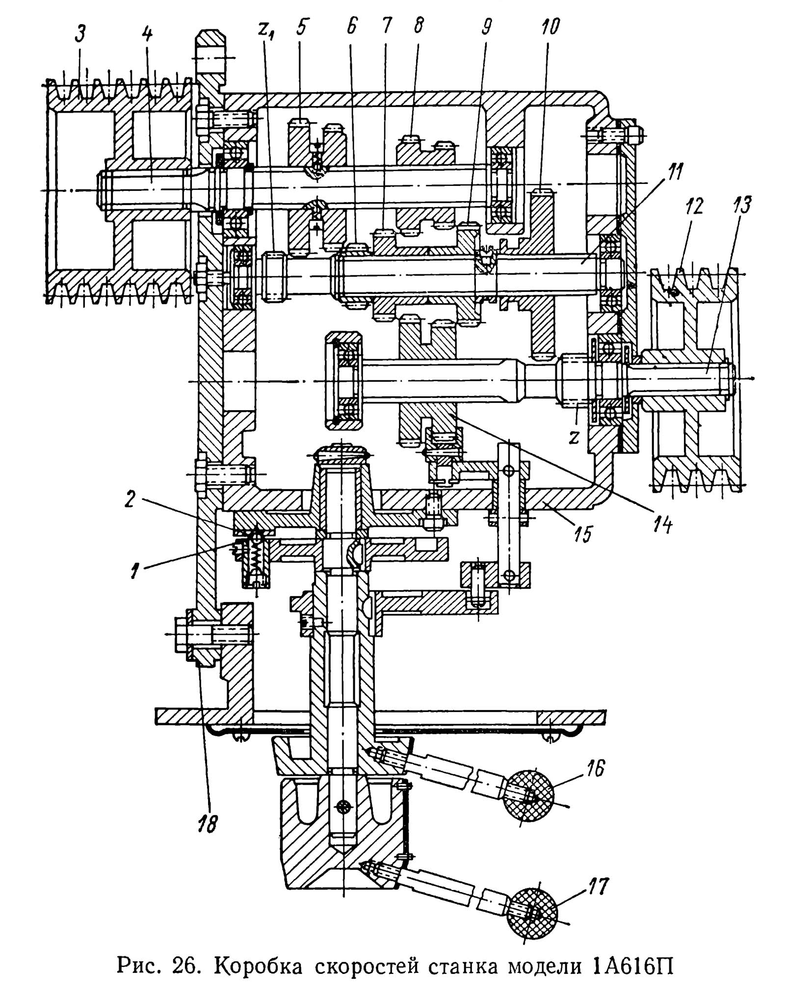 На станке моделі 1А616П применена трехвальная 12-ступенчатая коробка швидкостей. Приводной вал 13 (рис. 26) выполнен за одно целое з малой шестерней z. На шлицевом кінці етого вала консольно установлен шкив 12. На другом кінці вала 13 находится двойной подвижной блок шестерен 14. Промежуточный вал 11 также выполнен за одно целое з малой шестерней z1, имеющей, как і шестерня z, 14 зубьев. В средней частини промежуточного вала нерухомо закреплены шестерни 6, 7 і 9. Зубчатое колесо 10 може перемещаться по шлицам вала 11. На выходном валу 4 находятся два двойных подвижных блока шестерен 5 і 8 і приводной шкив 3.