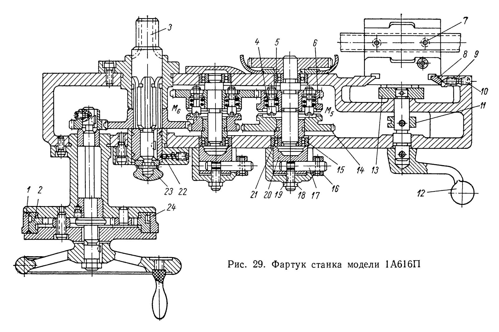 В станке моделі 1А616П применен фартук закрытого типа упрощенной конструкції, так как в нем нет дополнительного механізма для реверсирования подач. Увімкнення поперечных і продольных подач суппорта производится соответственно мелкозубчатыми кулачковыми муфтами М5 і М6 (рис. 29, см. также рис. 24).
