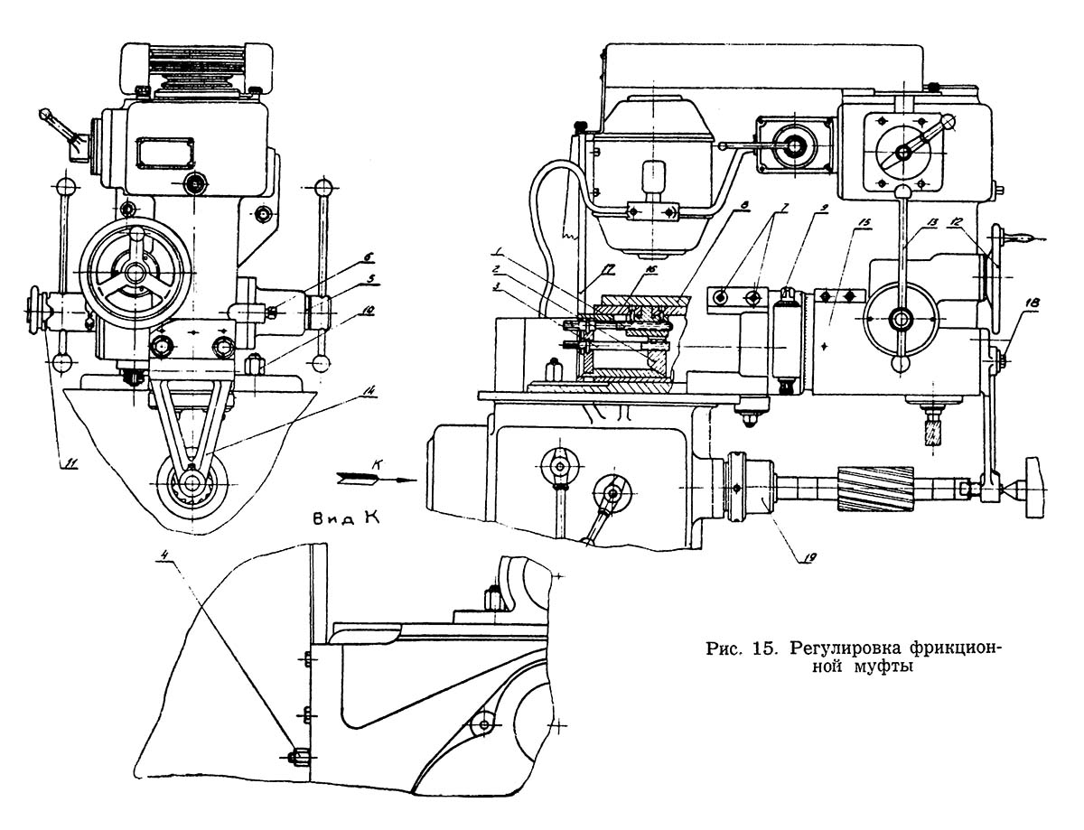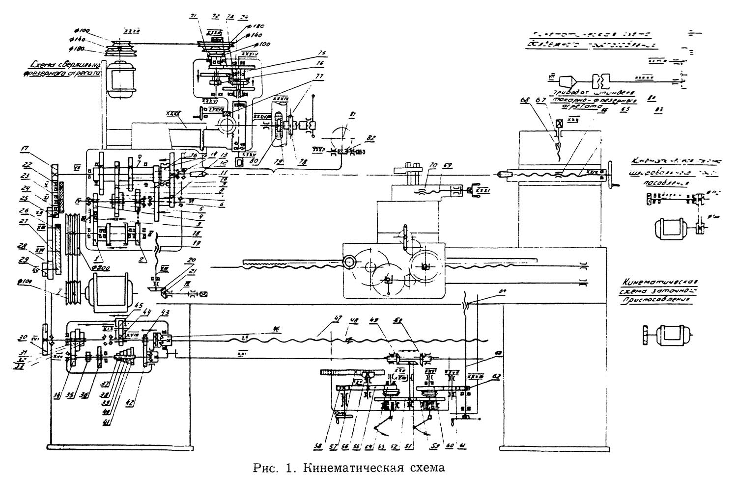 Привід шестерни 30 коробки подач осуществляется через трензель і набор шестерен 26, 27, 28, 29 гітари, положение которых остается постоянным даже при максимальном подъеме передньої бабки как во время точения і фрезерування, так і нарізання метрических резьб. Для нарізання дюймовых різьб шестерни гітари устанавливаются по таблице пли руководству.