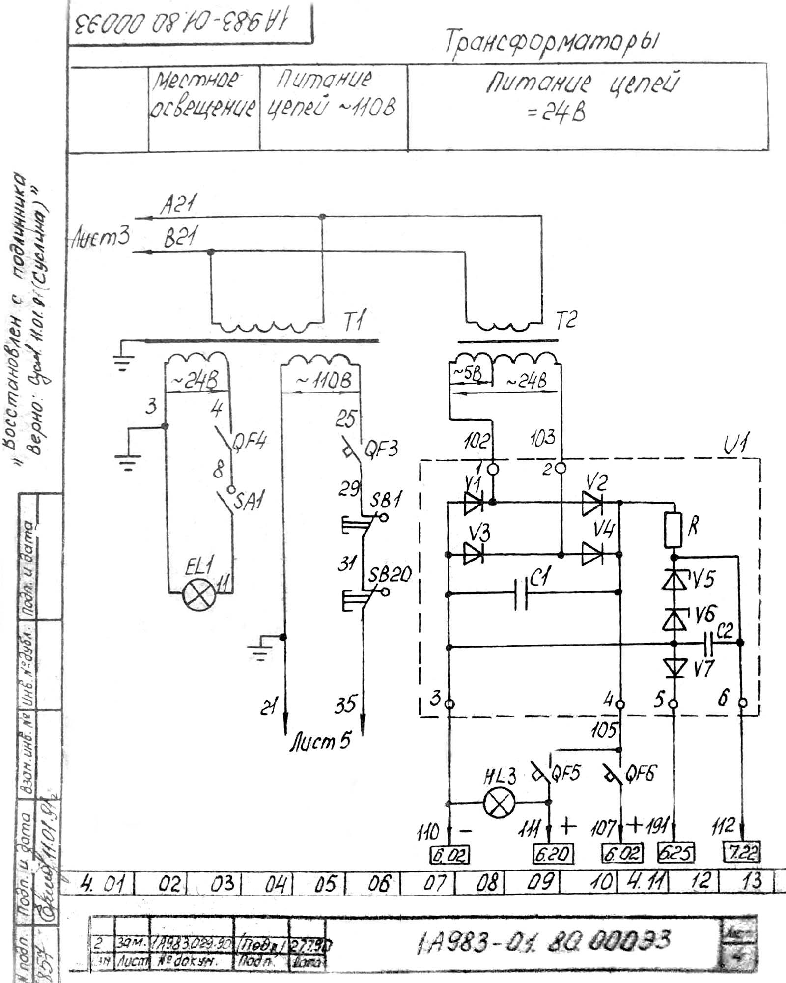Живлення ланцюгів керування змінного струму здійснюється напругою 110В, 50 Гц та живлення лампи місцевого освітлення 24В,50 Гц від понижуючого трансформатора Т1.