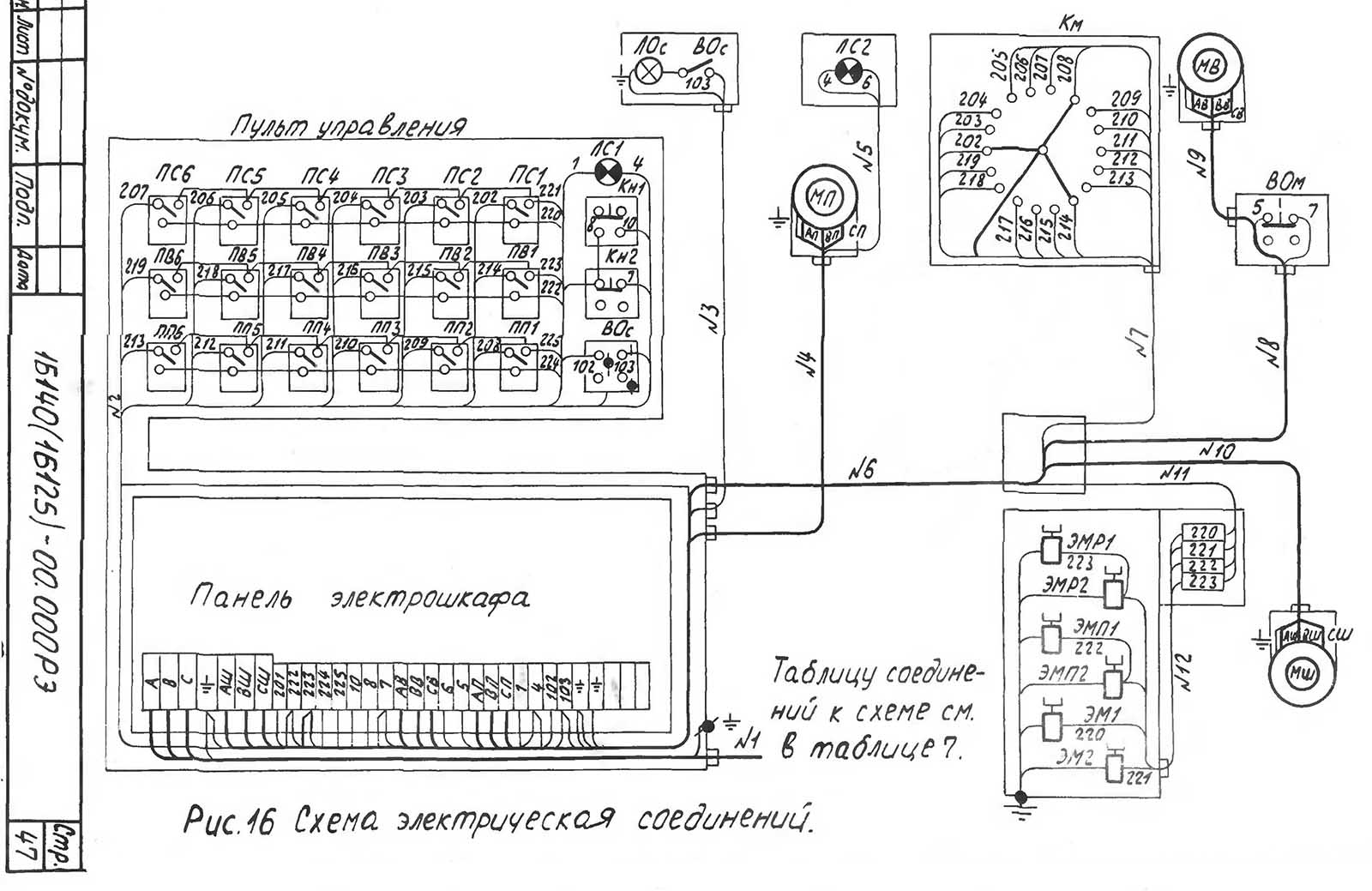 Схема передбачає зупинку всіх електродвигунів при закінченні матеріалу (прутка). Це досягається спрацюванням вимикача ВОМ (5-7).