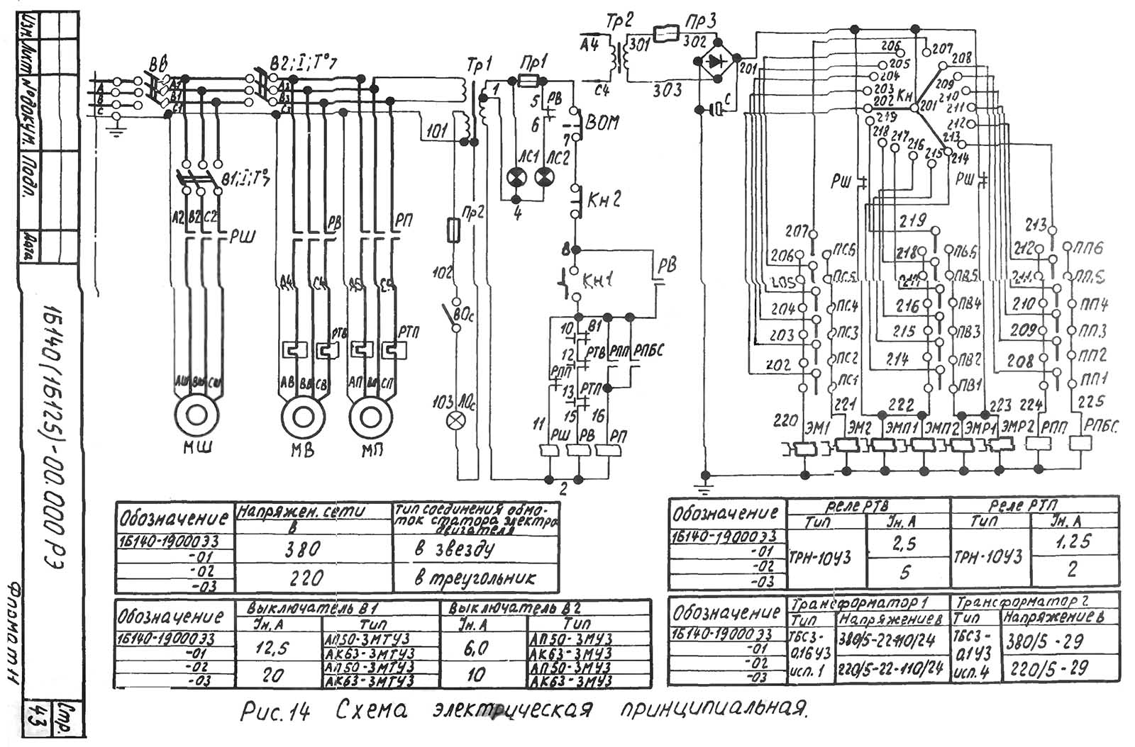 Значення номінальних струмів розчіплювачів автоматів та змінних нагрівачів реле дано на принциповій схемі (рис.14).