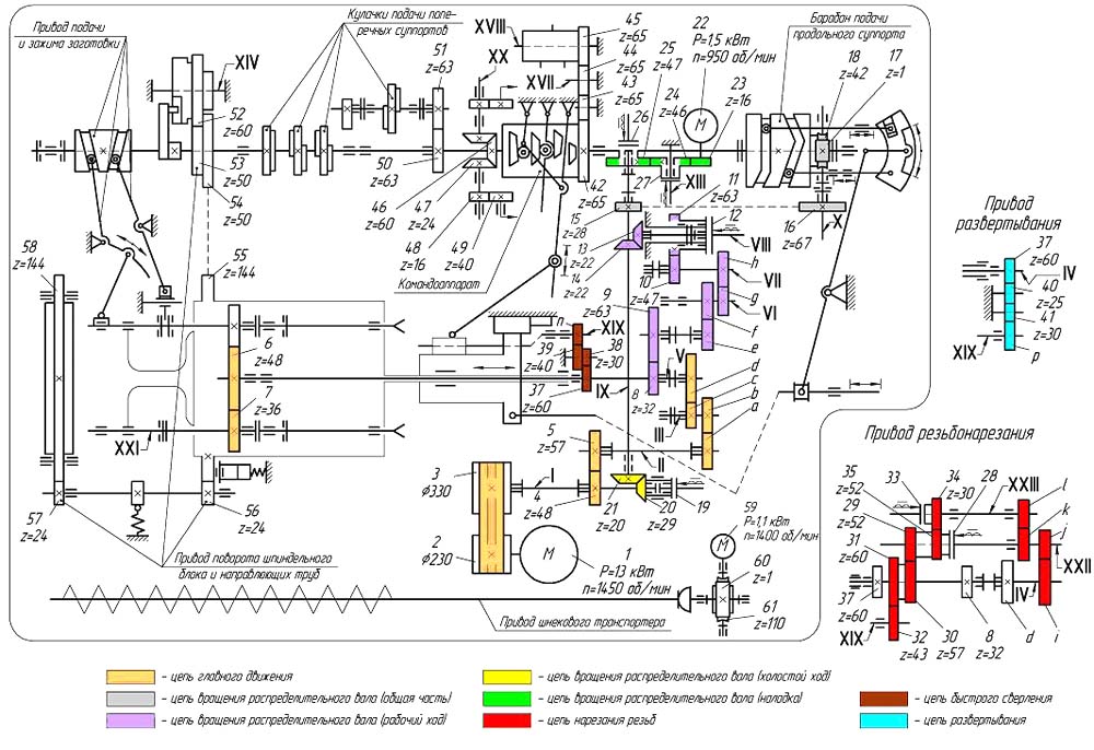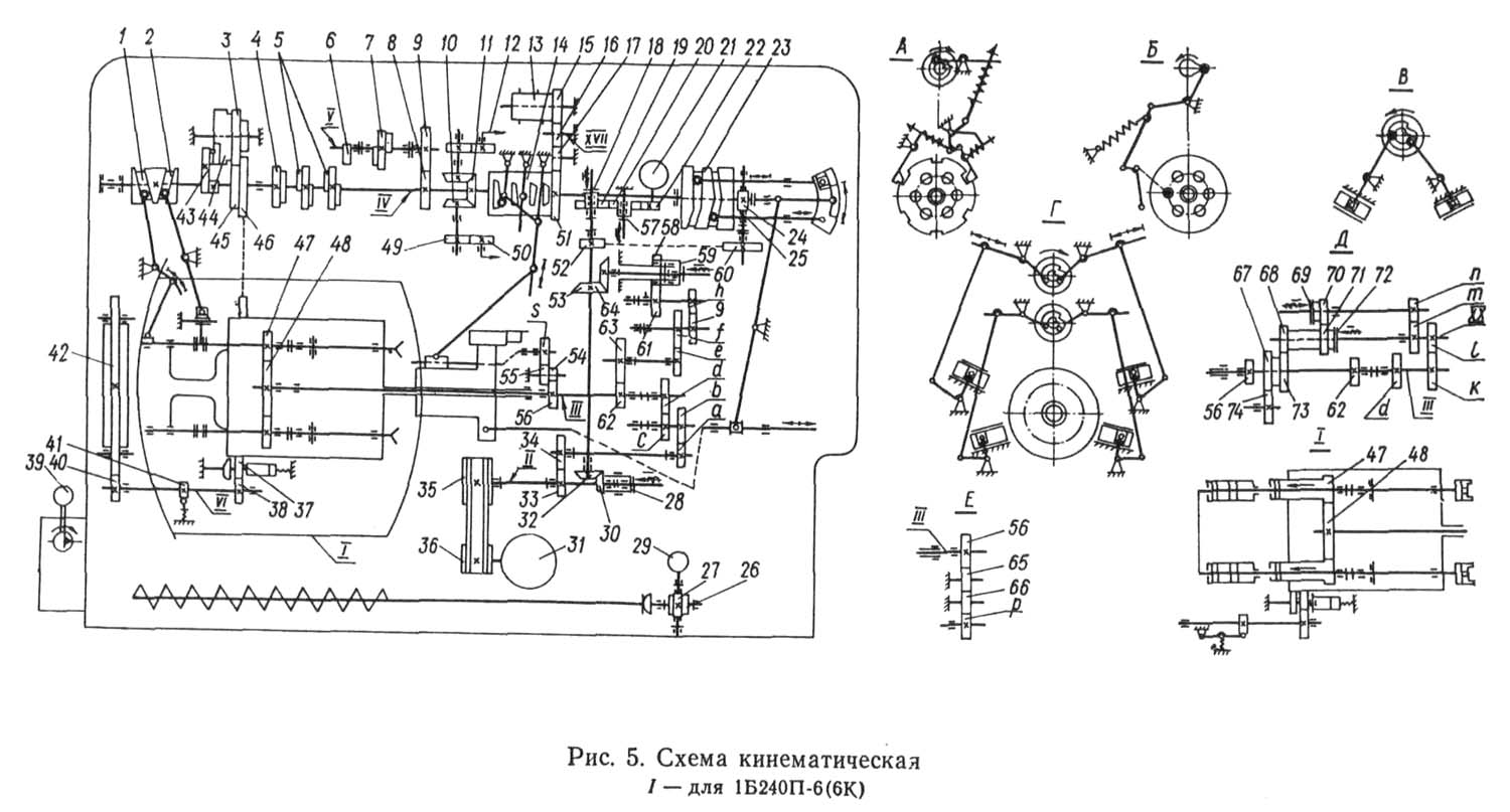 2. Схема кінематична шестишпиндельного напівавтомата 1Б240П. Завантажити у збільшеному масштабі