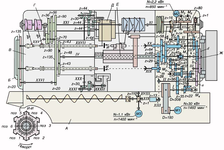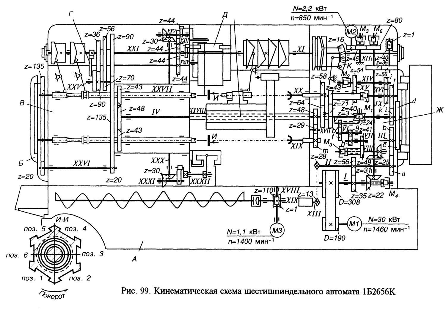 Кінематична схема шестишпиндельного токарного автомата 1Б265