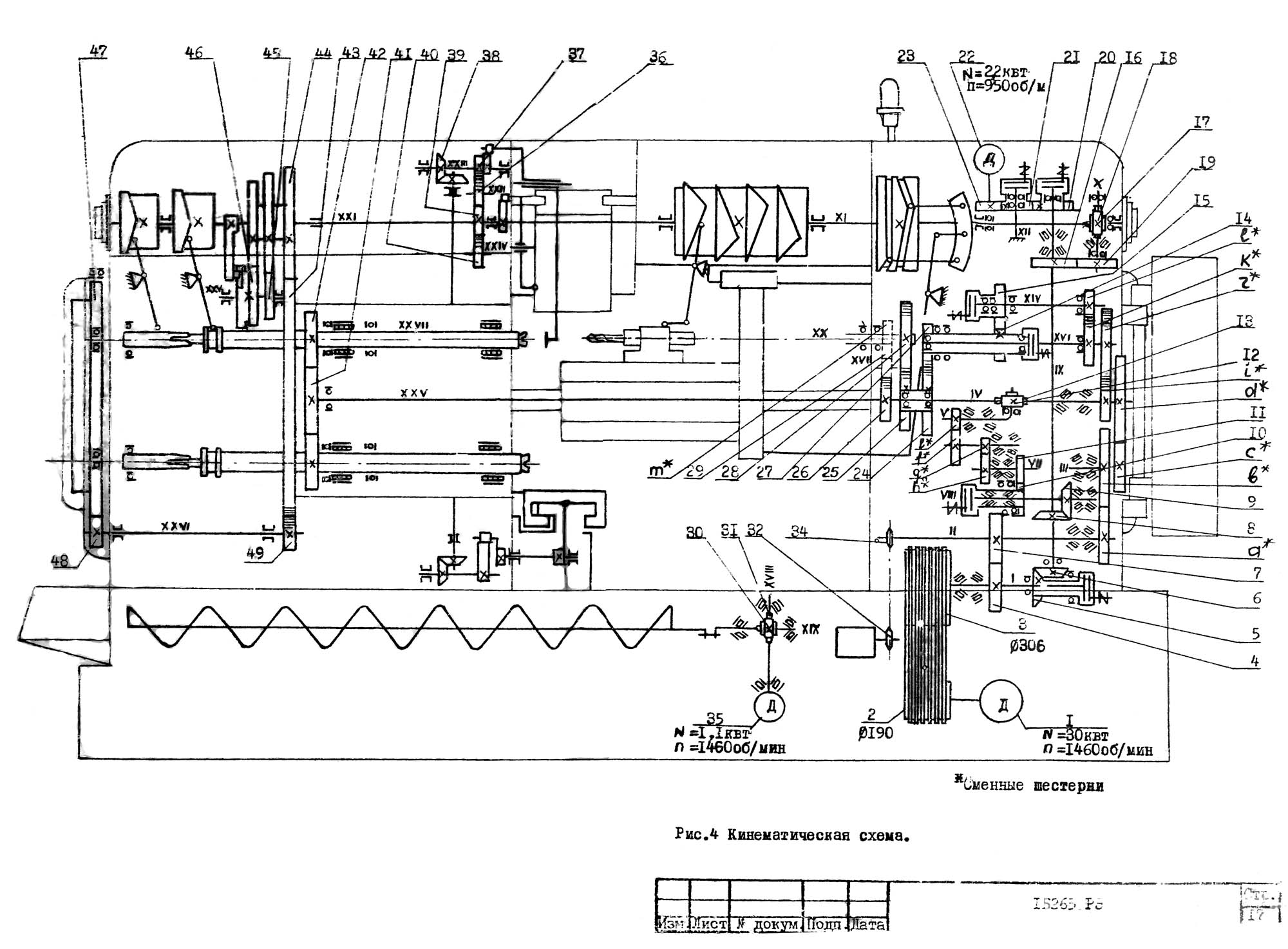 Від головного електродвигуна (n = 1460 об/хв) через клинопасову передачу отримує обертання I приводний вал верстата, від якого через шестерні 4 і 7 обертається вал II, з'єднаний змінними шестернями a:b. c:d з валом III IV — центральним валом верстата.