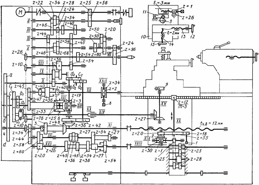 Гвинторізний рух пов'язує обертання шпинделя з переміщенням супорта від ходового ггвинта. Передача руху від шпинделя на ходовий гвинт здійснюється через реверсивний механізм (трензель) та двопарну гітару налаштування. Передача руху на трензель можлива безпосередньо зі шпинделя або через ланку збільшення кроку.
