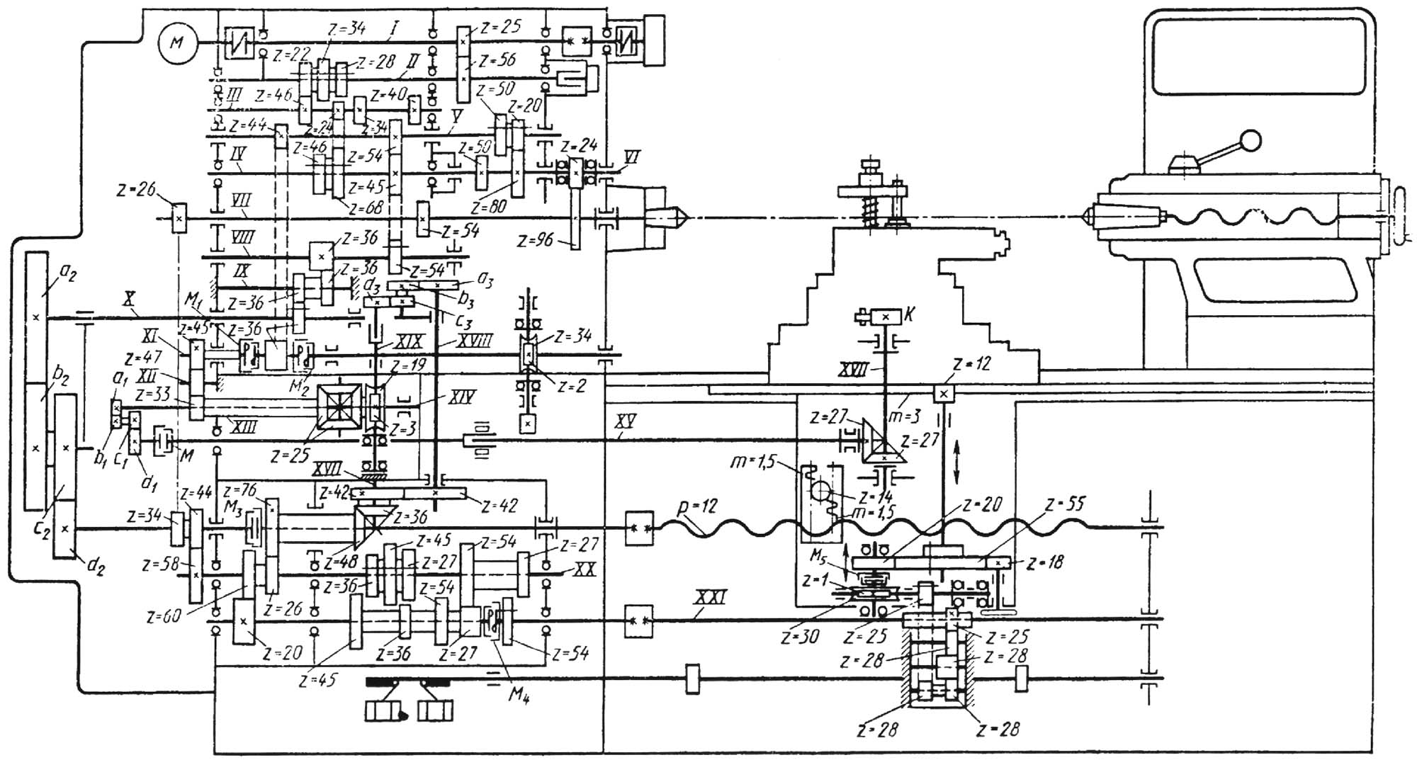 Головний рух (обертання шпинделя) здійснюється від двошвидкісного електродвигуна потужністю N = 3/4,5 кВт і частотою обертання nед = 700/1400 об/хв. У коробці швидкостей, у якій розташовані два блоки зубчастих коліс, набір шестерень та перебір, забезпечується десять різних частот обертання шпинделя. При робочому ході частота обертання електродвигуна nед = 700 об/хв і діапазон частот обертання nшп = 2,8..6,3 об/хв. Зворотне обертання шпинделя здійснюється реверсуванням електродвигуна (Пед = 1400 об/хв). Всі вали коробки швидкостей, що швидко обертаються, встановлені на підшипниках кочення, а тихохідні — на підшипниках ковзання (для забезпечення високої точності і вібростійкості). Шпиндель верстата змонтований на двох регульованих підшипниках ковзання, передній з них – конічний, а задній – циліндричний.