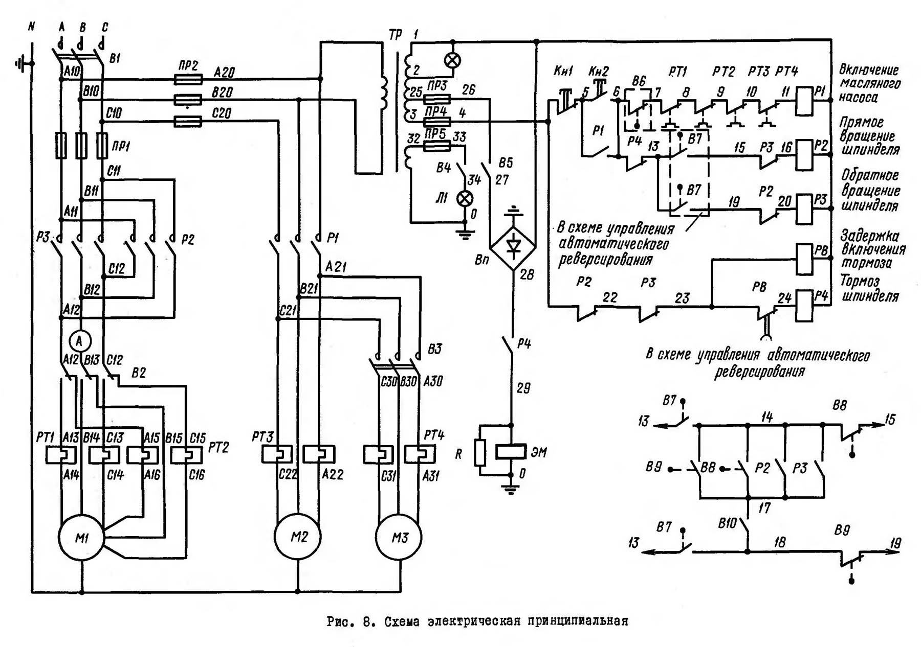 Увімкнення електрической частини верстата осуществляется пакетным выключателем B1. Затем кнопкой Кн2 через магнитный пускатель PI включается електродвигатель змазки М2. После етого рукояткой керування 22 (см. рис. 2), связанной з конечным выключателем В7, осуществляется увімкнення головного приводу М1 через реверсивный магнитный пускатель Р2 (прямое вращение) или Р3 (обратное вращение).