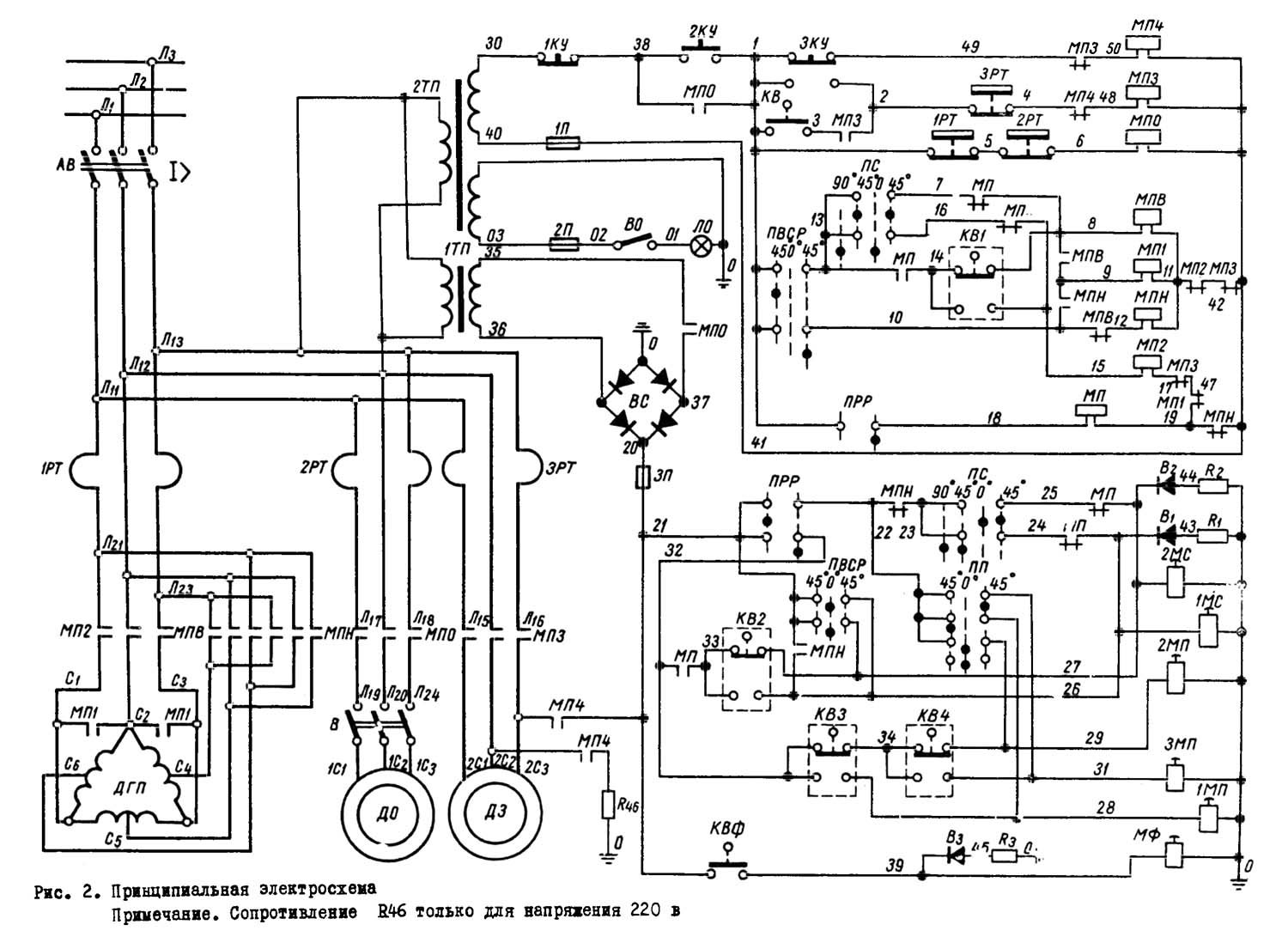 При положенні перемикача ПВСР 45° вліво (пряме обертання) ланцюгом 1-13 готується включення магнітних пускачів МПВ, МП1 до МП2.