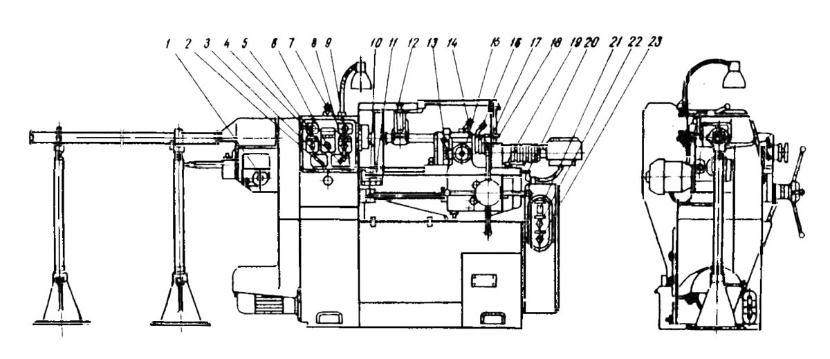 Розташування основних частинин револьверного верстата 1Г325. Завантажити у збільшеному масштабі