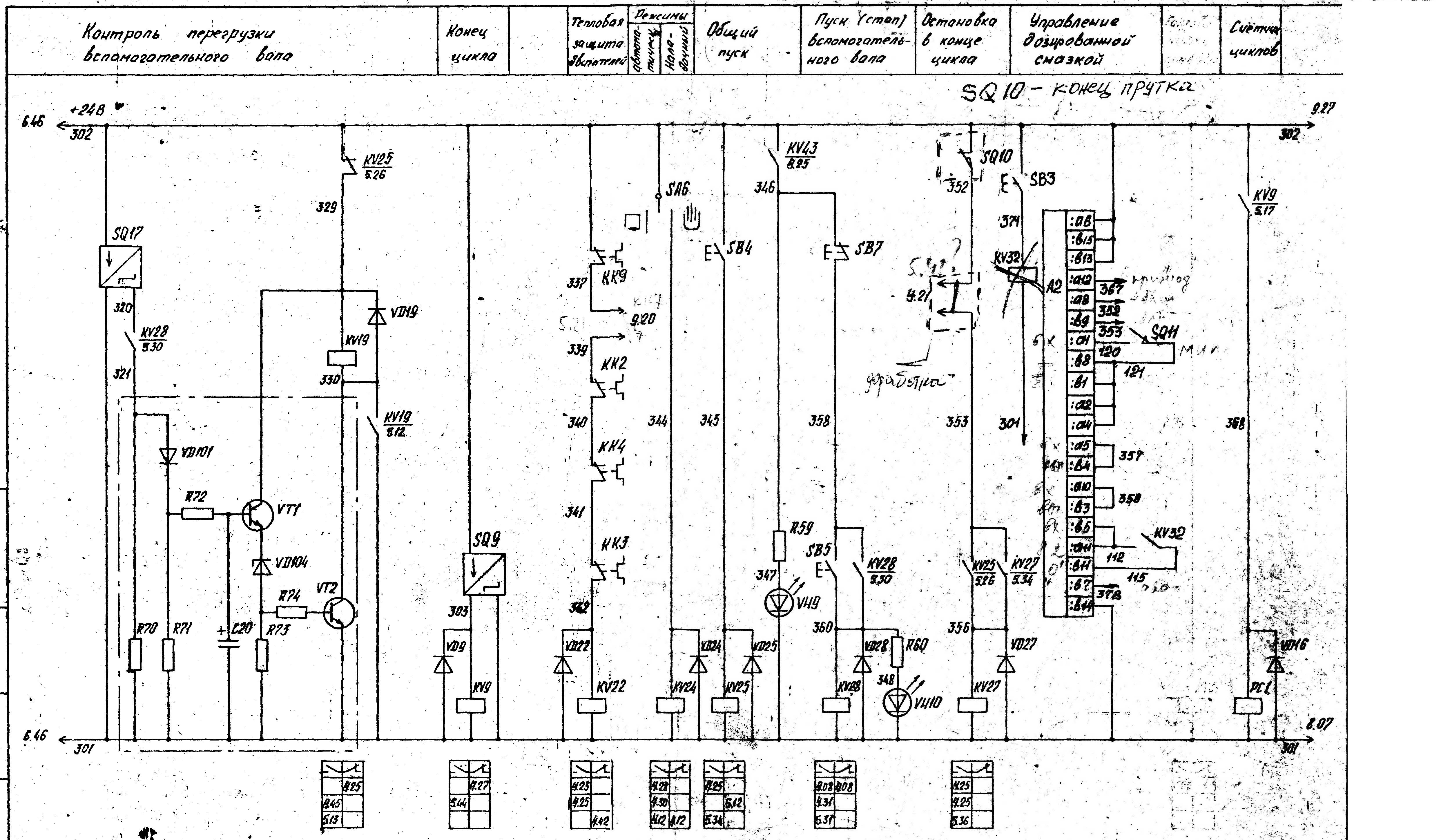 При включеному KV47 або KV48 включаються відповідно пускач KM9 та реле часу КТ1 або пускач КМ10 та реле часу КТ2.