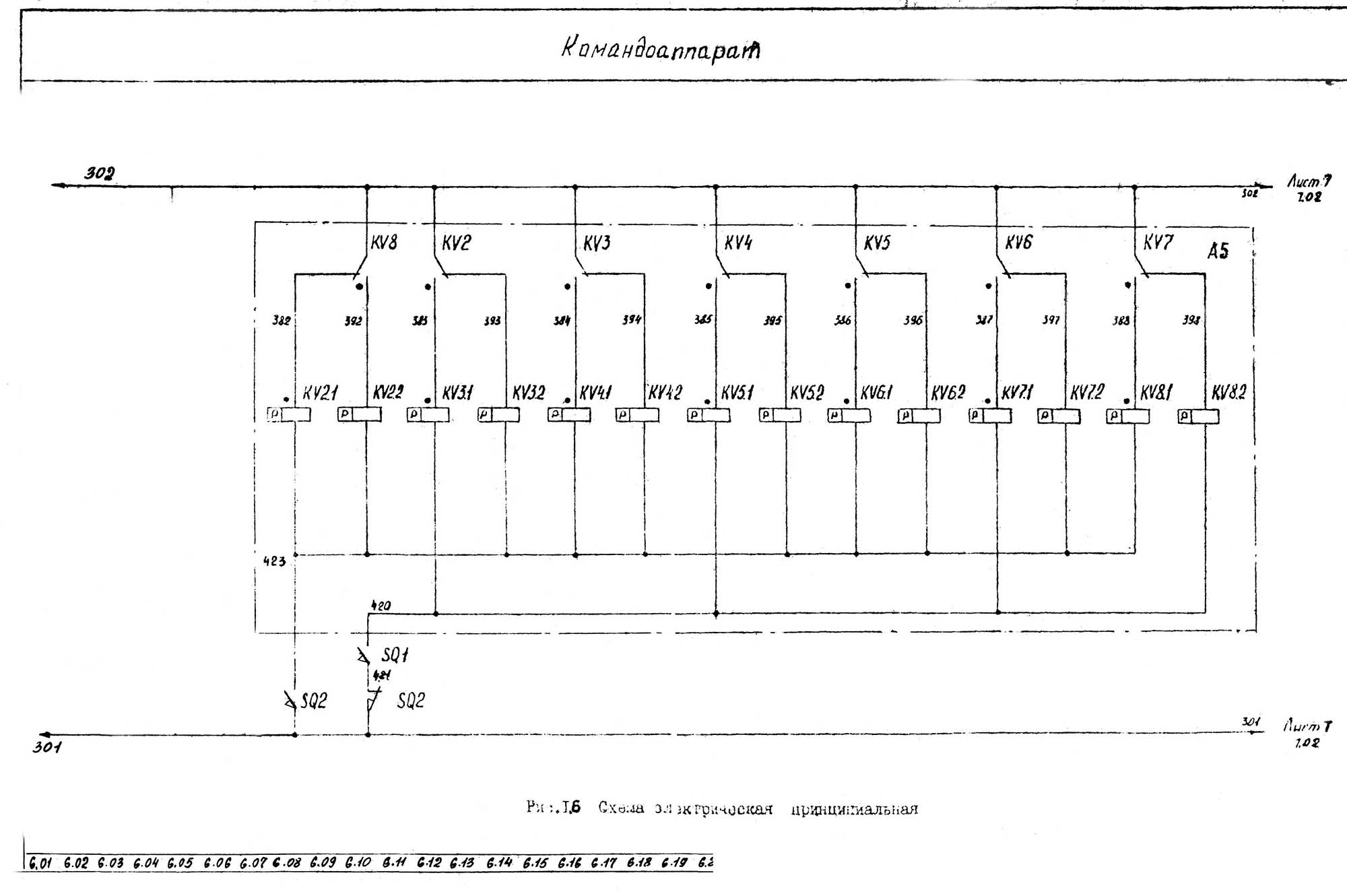 Командоапарат виконаний на поляризованих реле KV2...KV8, керованих від мікроперемикачів SQ1 та SQ2. Поляризоване реле має два перемикаючі контакти, стан яких змінюється подачею напруги на котушки, що управляють, що включають К2,1...К8.1 і відключають -К2.2...К8.2. При зникненні напруги поляризоване реле зберігає стан контактів, що відповідає останньому включенню. При почерговому натисканні SQI та SQ2 відбувається послідовне включення реле KV2...KV7. Включаючись, реле KV7 готує ланцюг вмикання реле KV8 від мікроперемикача SQ2. При натисканні SQ2 включається реле KV8, яке, у свою чергу, подавши напругу на котушку KV2.2, відключає реле KV2, далі відбувається послідовне відключення всього ланцюга реле до KV7. Після наступного натискання SQI вимикається реле KV8, готуючи ланцюг увімкнення реле KV2. Далі цикл повторюється.