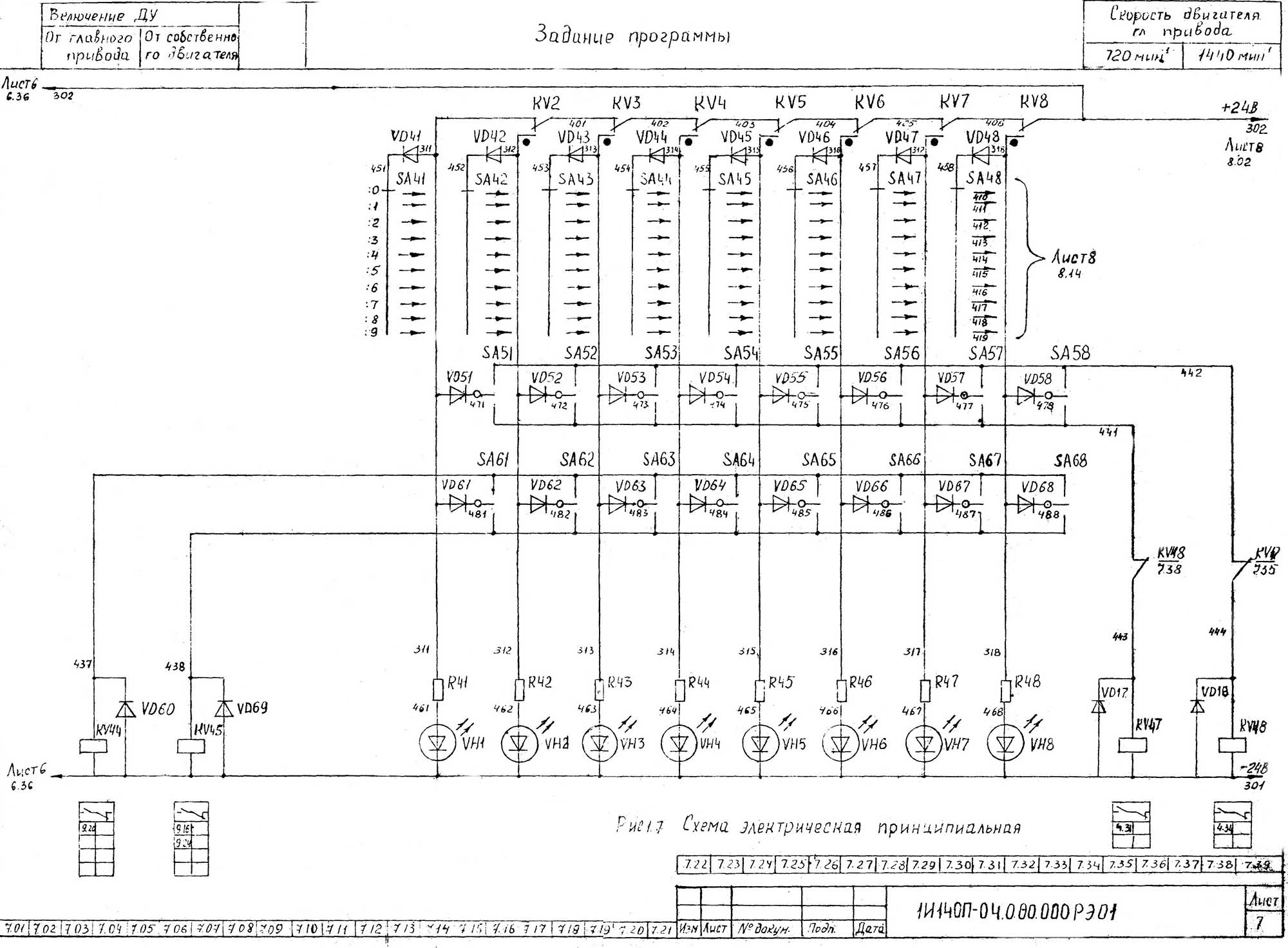 Електрична схема токарно-револьверного верстата 1І140п, 1І125п. Дивитись у збільшеному масштабі