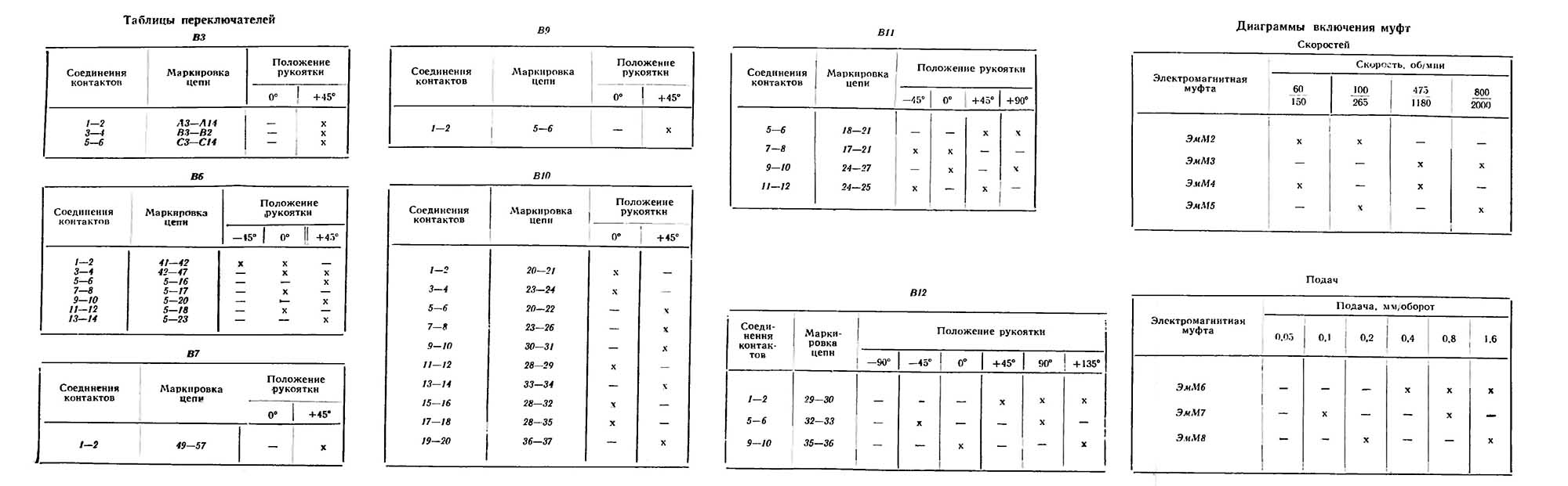 Электросхемой верстата передбачаєся возможность переключения швидкостей і подач вручную переключателями В11, В12, установленными на пульті керування, і автоматически — командоапаратом при повороте револьверної головки. Переход з ручного переключения на автоматическое осуществляется переключателем В10, установленным на пульті верстата.