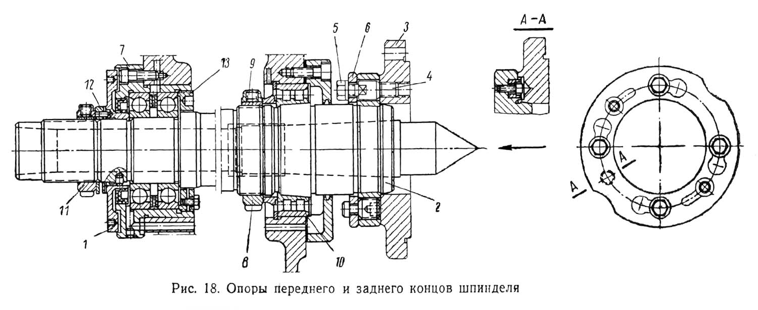 Регулювання осьового зазору радиальных упорных підшибників задньої опори шпинделя производится вне корпуса бабки гайкой 11 через тепловой компенсатор 12. Натяг осуществляется поворотом гайки вправо на угол 18..20° до того, как в стыках между підшипниками і приставками будут выбраны зазоры. Наружные кольца устанавливаются вплотную до упора гайкой 13.