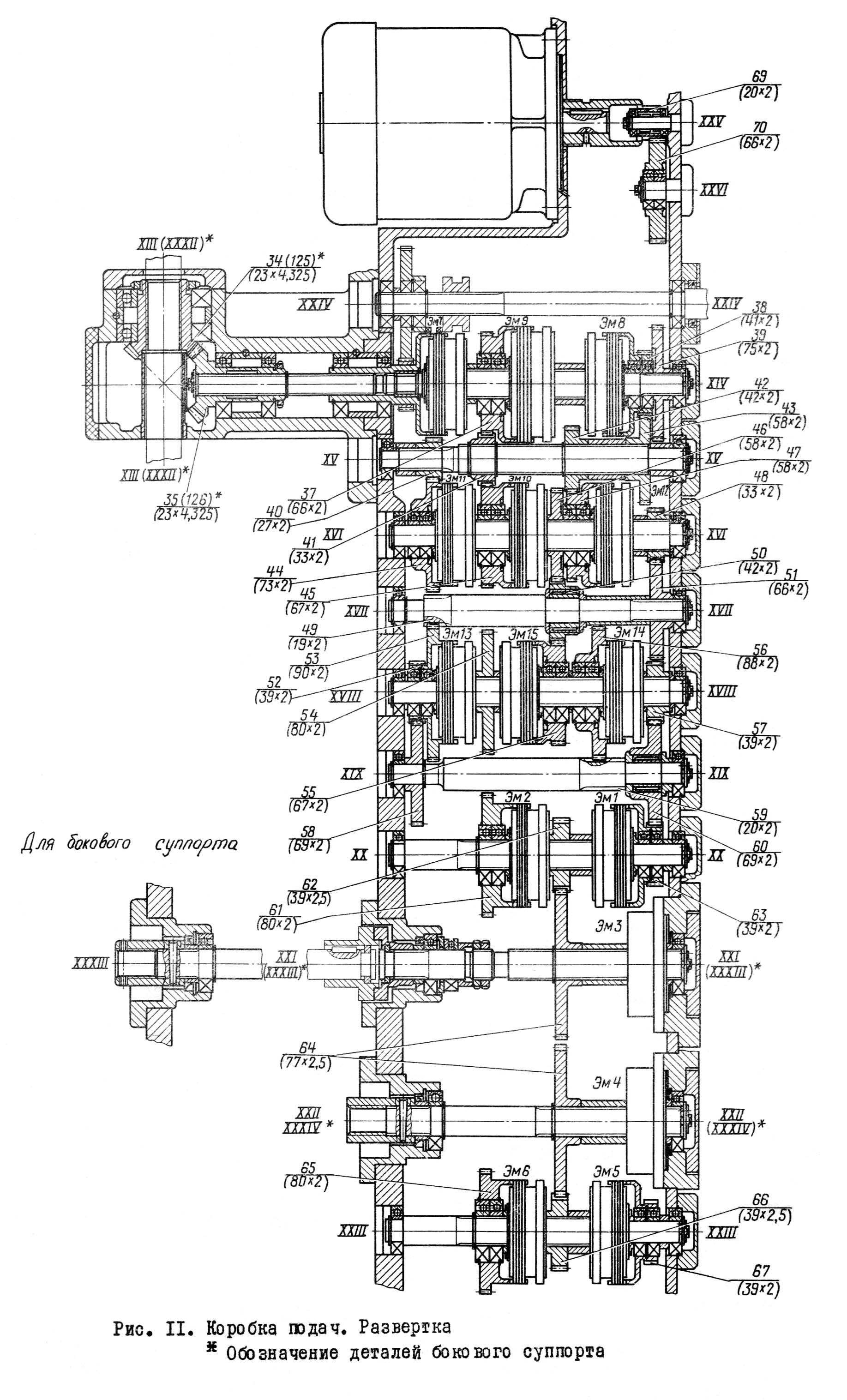 На рис. 11 показана розгортка коробки подач правого вертикального супорта. Ліва коробка подач аналогічна правій і відрізняється лише лівим виконанням корпусу, кронштейна та розташуванням муфт.