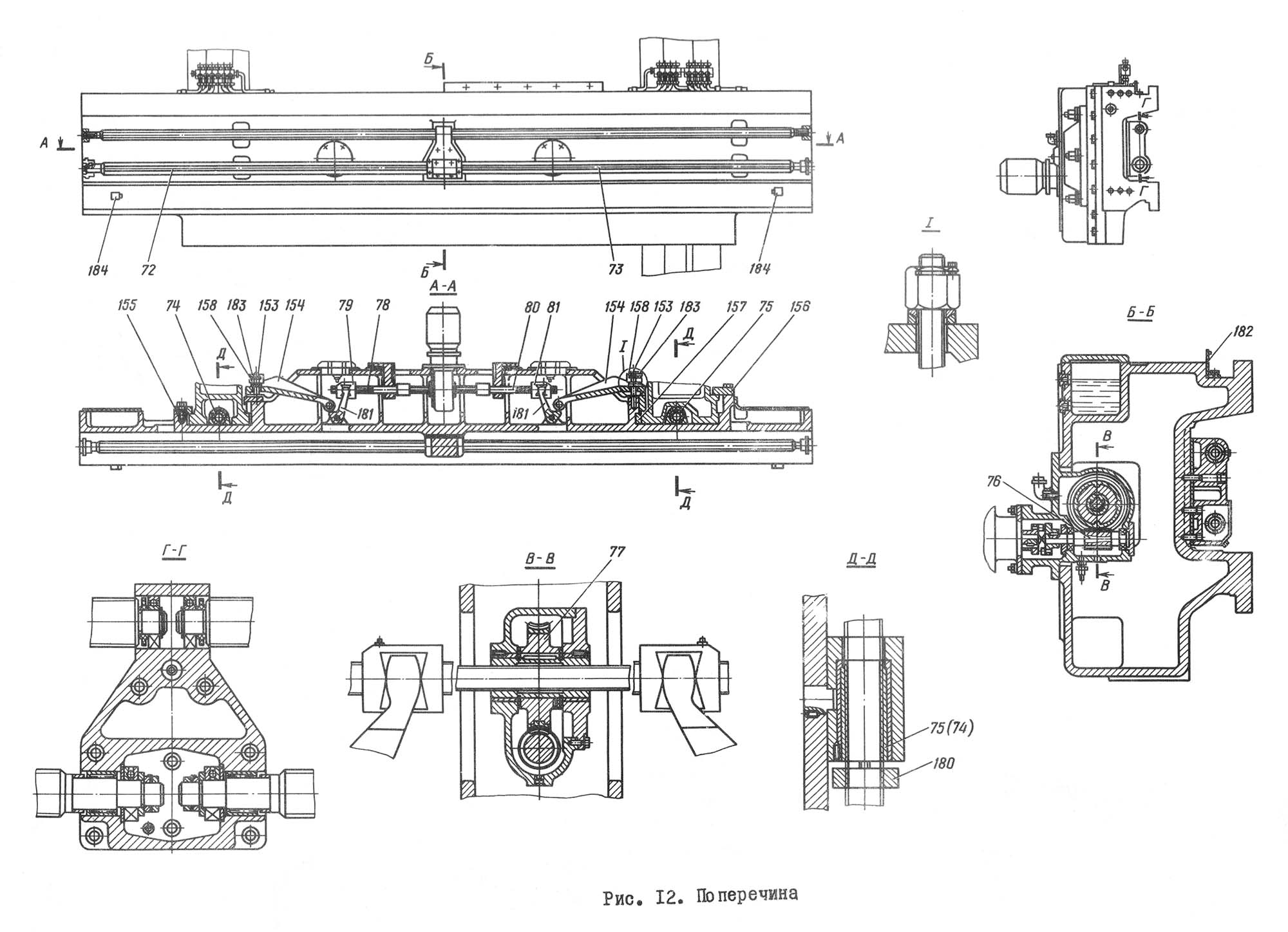 Поперечка (рис. 12) розміщується на направляючих стійках. Її корпус являє собою виливок, поперечний переріз якого має коробчасту форму з розвиненою системою ребер. Попереду корпус поперечки має горизонтальні прямокутні напрямні, якими переміщаються вертикальні супорти.