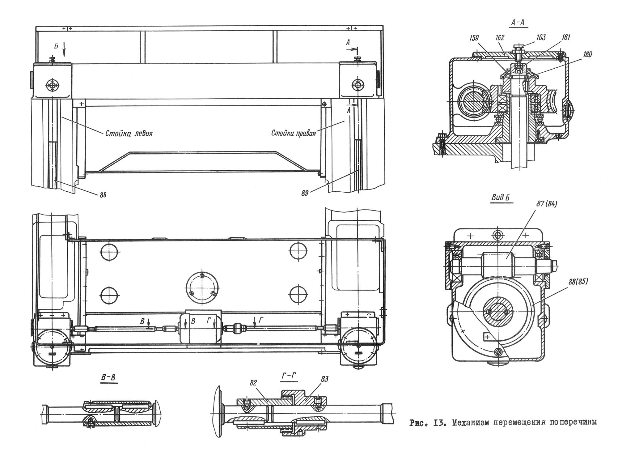 Між направляючими у ніші розміщуються ходові вали та ходові гвинти, які монтуються у жорсткому знімному кронштейні та коробках подач. Поперечка має вертикальне настановне переміщення по направляючих стійок, яке здійснюється механізмом переміщення поперечини, і обмежується кінцевими вимикачами.