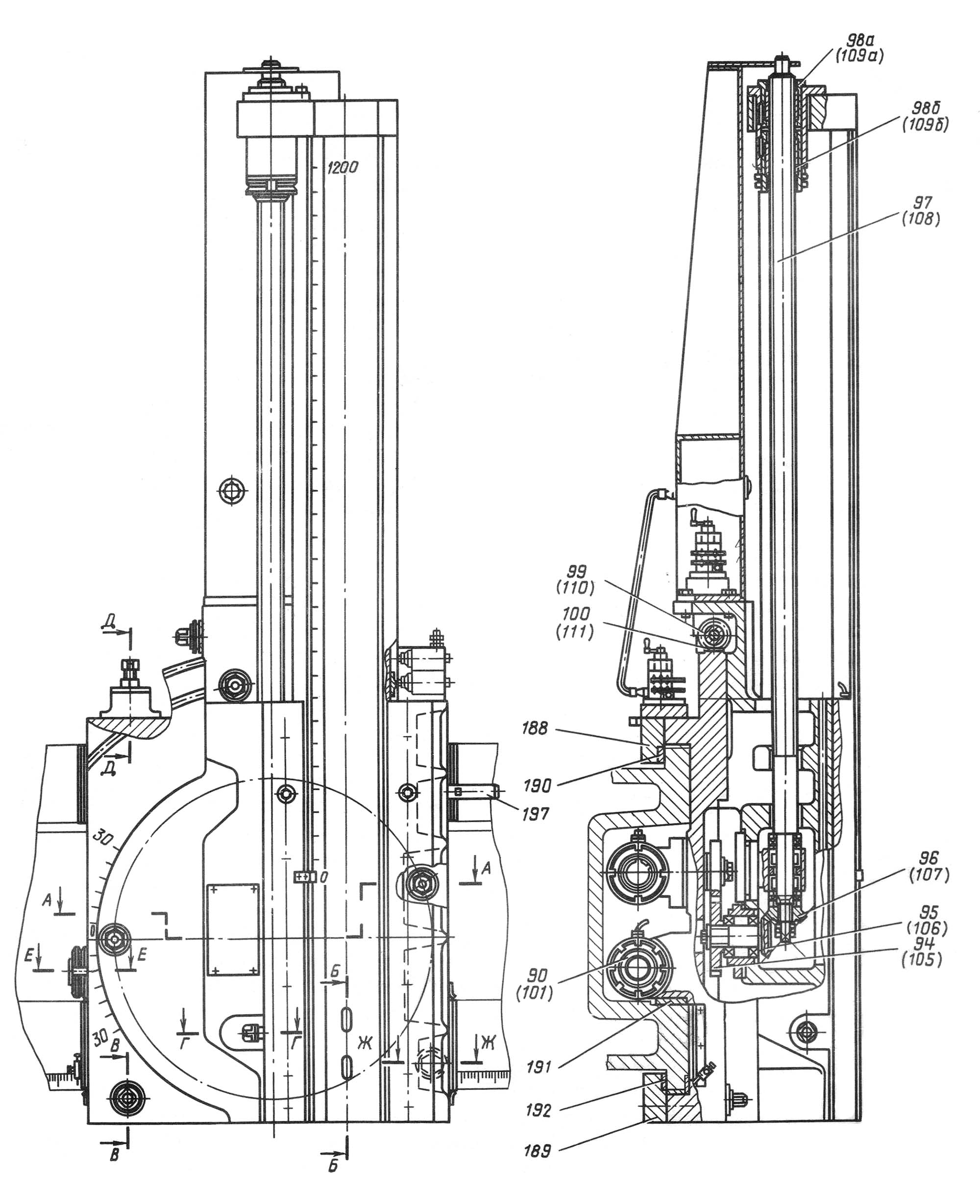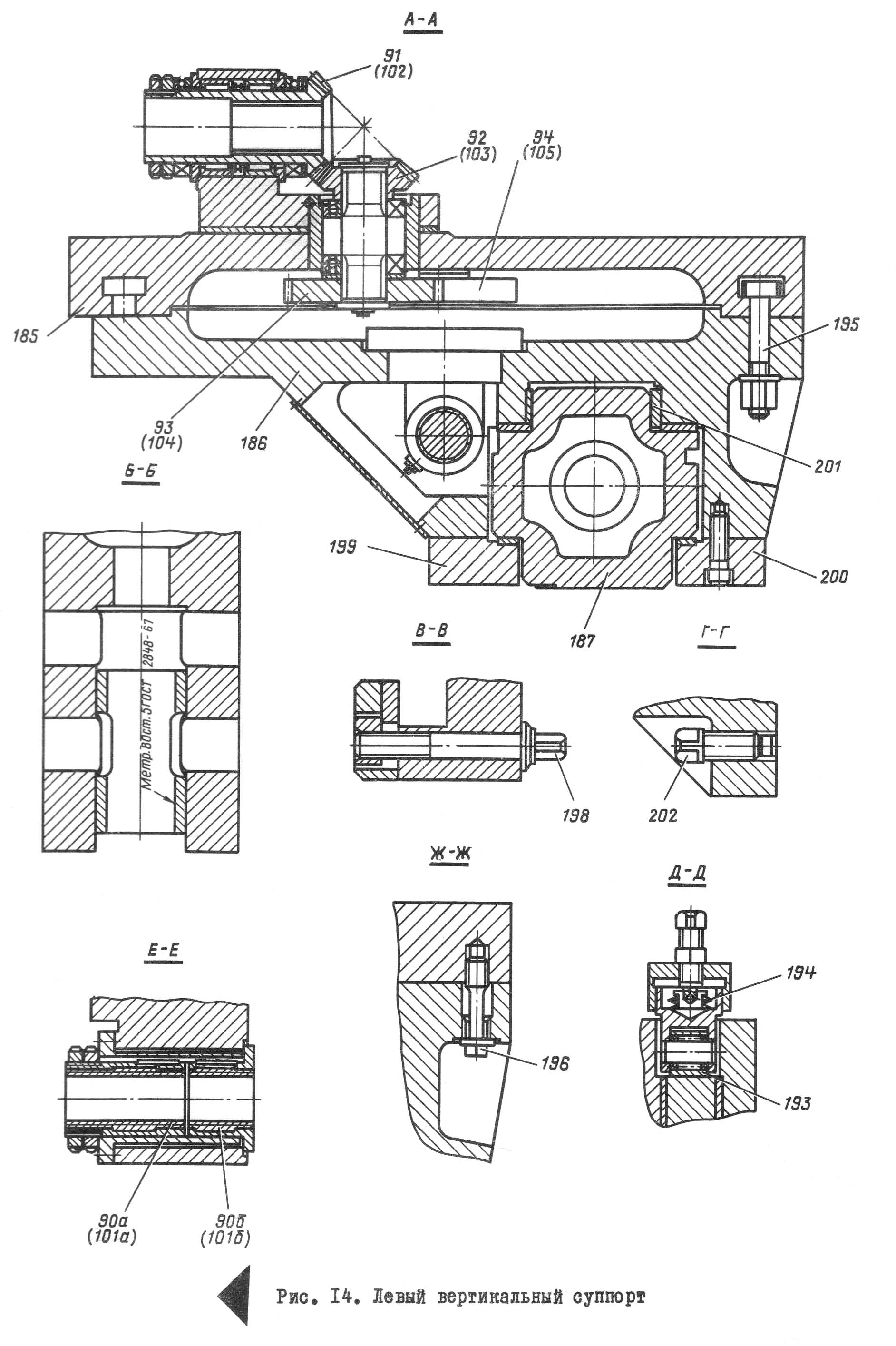 На рис. 14 зображено лівий вертикальний супорт. Правий суппорт го конструкції аналогічний лівому і відрізняється лише правим виконанням корпусних деталей.