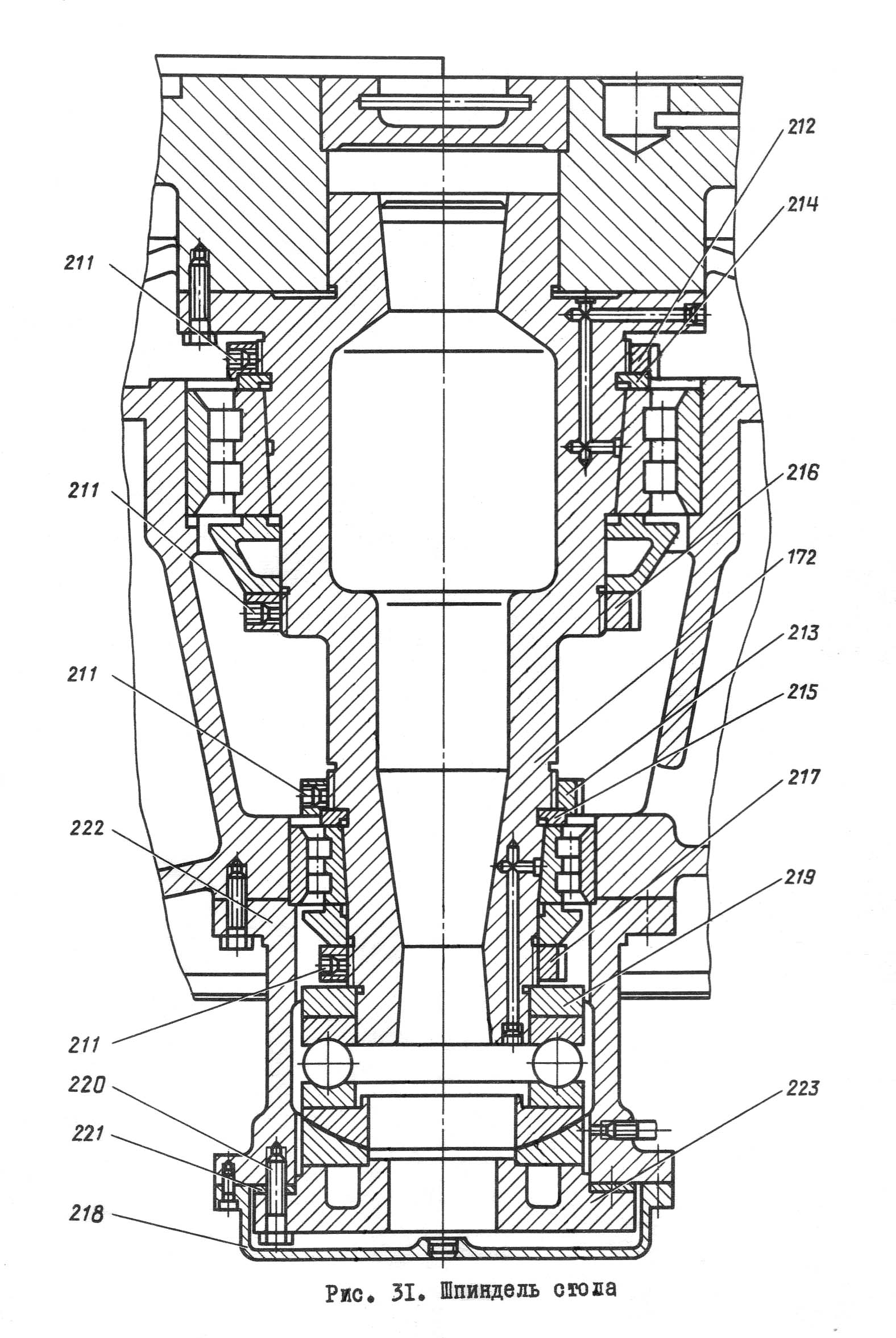 Регулювання підшибників шпинделя столу (рис. 31) зводиться до зменшення радіального зазору за рахунок збільшення зовнішніх діаметрів внутрішніх кілець підшибників шляхом напресування їх на конічні шийки шпинделя 172. Порядок регулювання наступний: