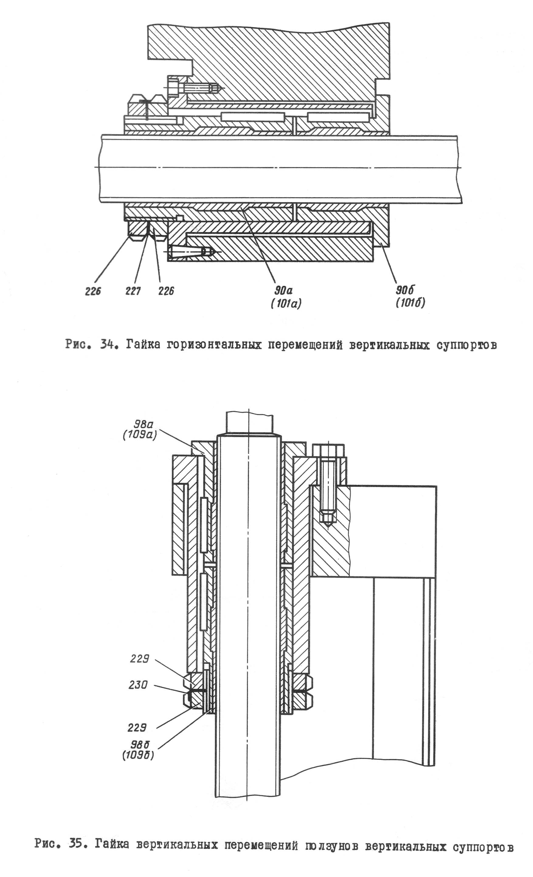Для цього суппорт ставлять у положення, при якому 90 гайки (101) стають доступними через вікна в поперечині. Гайки 226 звільняють від запобіжної шайби 227 та їх поворотом на різьбовій частині гайок 90 (101) усувають зайвий зазор у різьбовій парі.