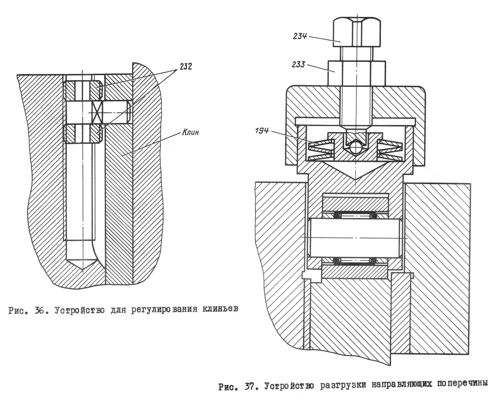При зносі направляючих верстата виникають зазори, що перевищують допустимі, що негативно позначається на точності верстата. Їх усунення здійснюється регулюванням клинів (рис. 36), для чого відпускається внутрішня гайка 232, а зовнішньою гайкою здійснюється переміщення клина так, щоб він щільно прилягав до поверхні ковзання та опорної поверхні. При цьому щуп 0,04 мм не повинен заходити між сполученими поверхнями, "Закушування" щупа з торців у направляючих допускається на глибину до 25 мм лише на окремих ділянках торців. Після закінчення регулювання гайки 232 затягуються.
