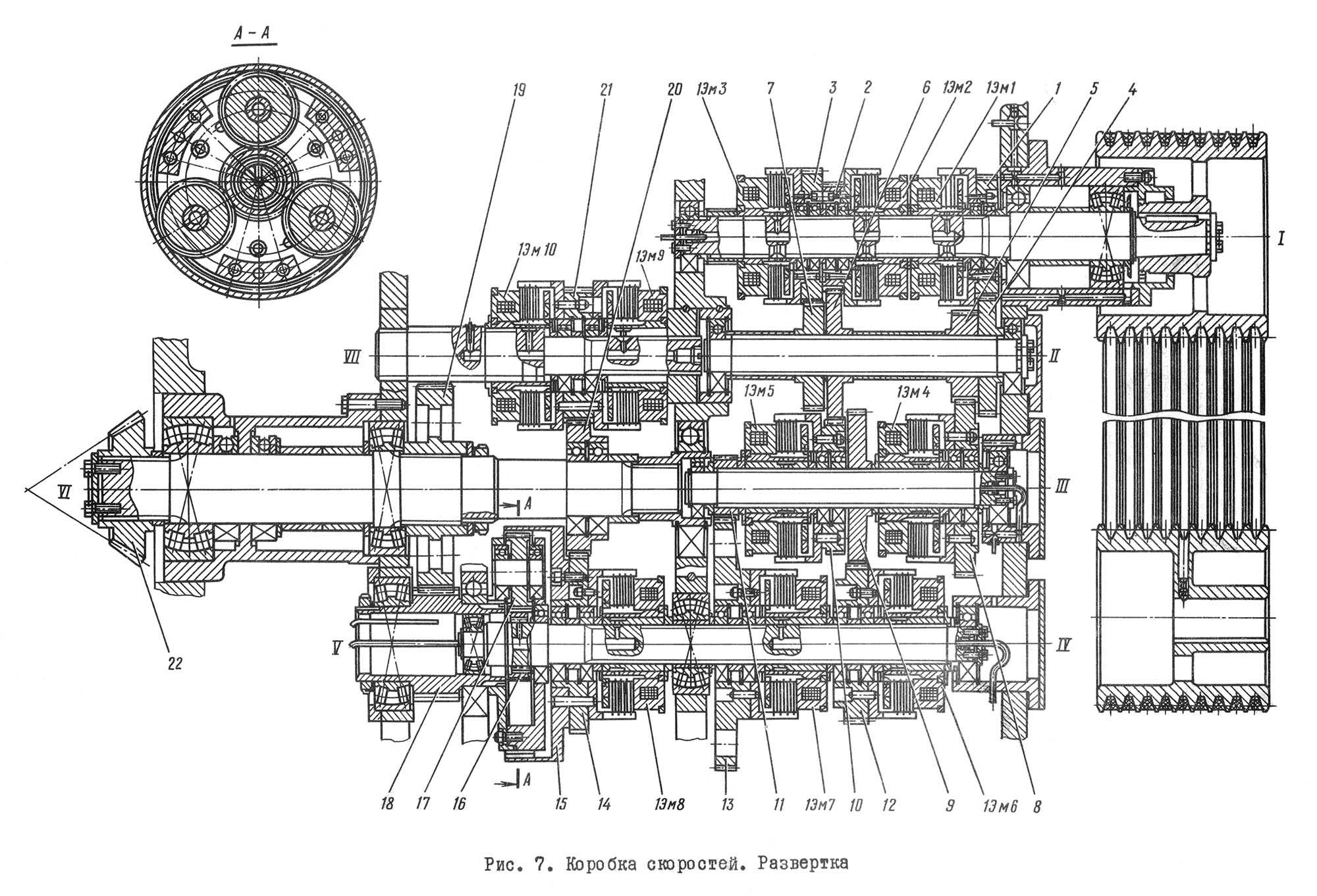 Наявність у коробці швидкостей косозубих зубчастих коліс забезпечує плавність роботи передач при значних окружних швидкостях. Всі зубчасті колеса коробки швидкостей знаходяться у постійному зачепленні.