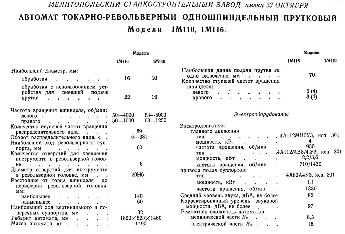Автомати токарно-револьверні одношпиндельні пруткові моделі 1М116 та 1М110 призначені для виготовлення деталей типу тіл обертання з каліброваного прутка різних марок сталей, кольорових металів та їх сплавів з найбільшим діаметром обробки 12.18 мм. при застосуванні пристрою для зовнішньої подачі – 18..22 мм.