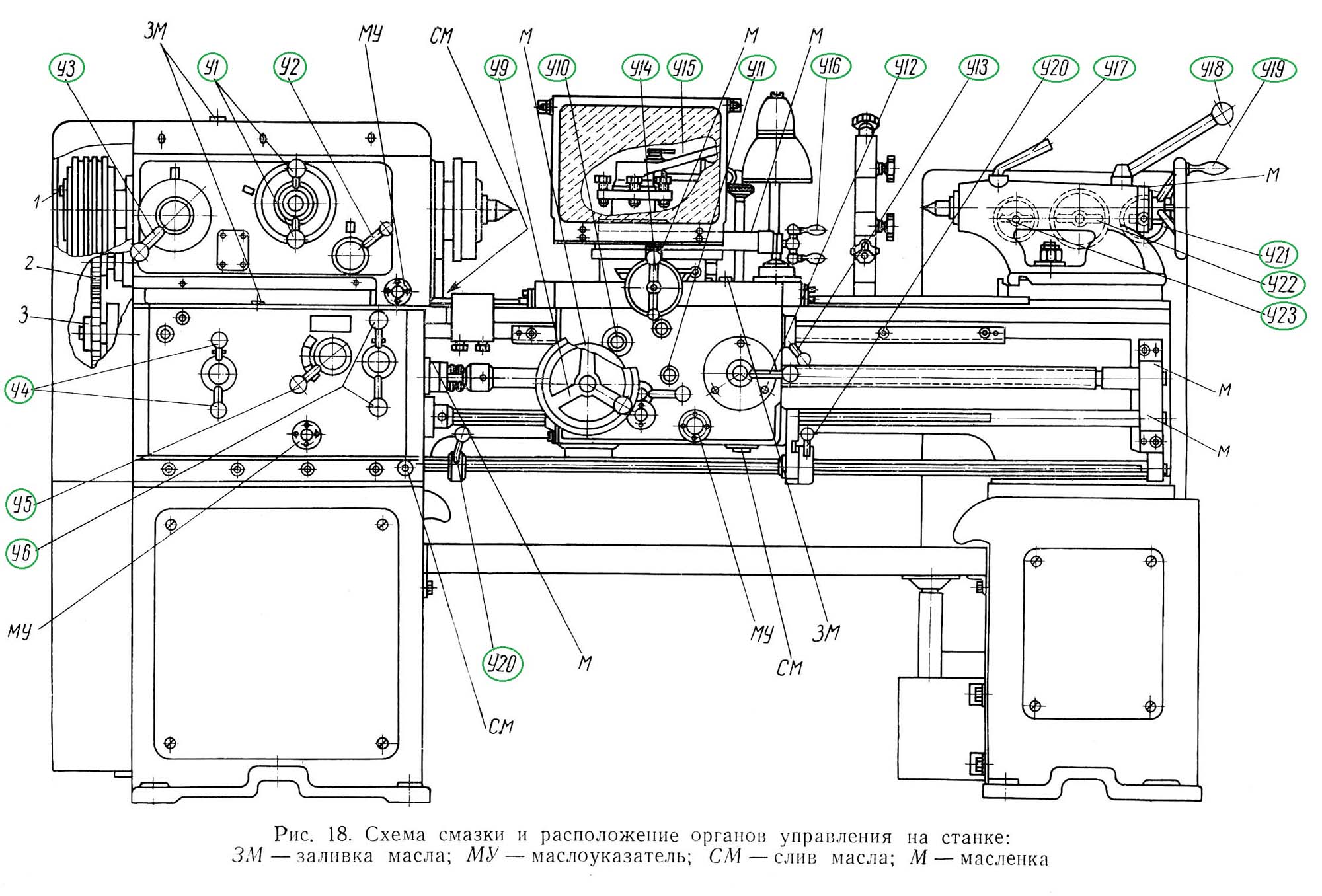 Розташування органів керування токарно-гвинторізним верстатом 1м61