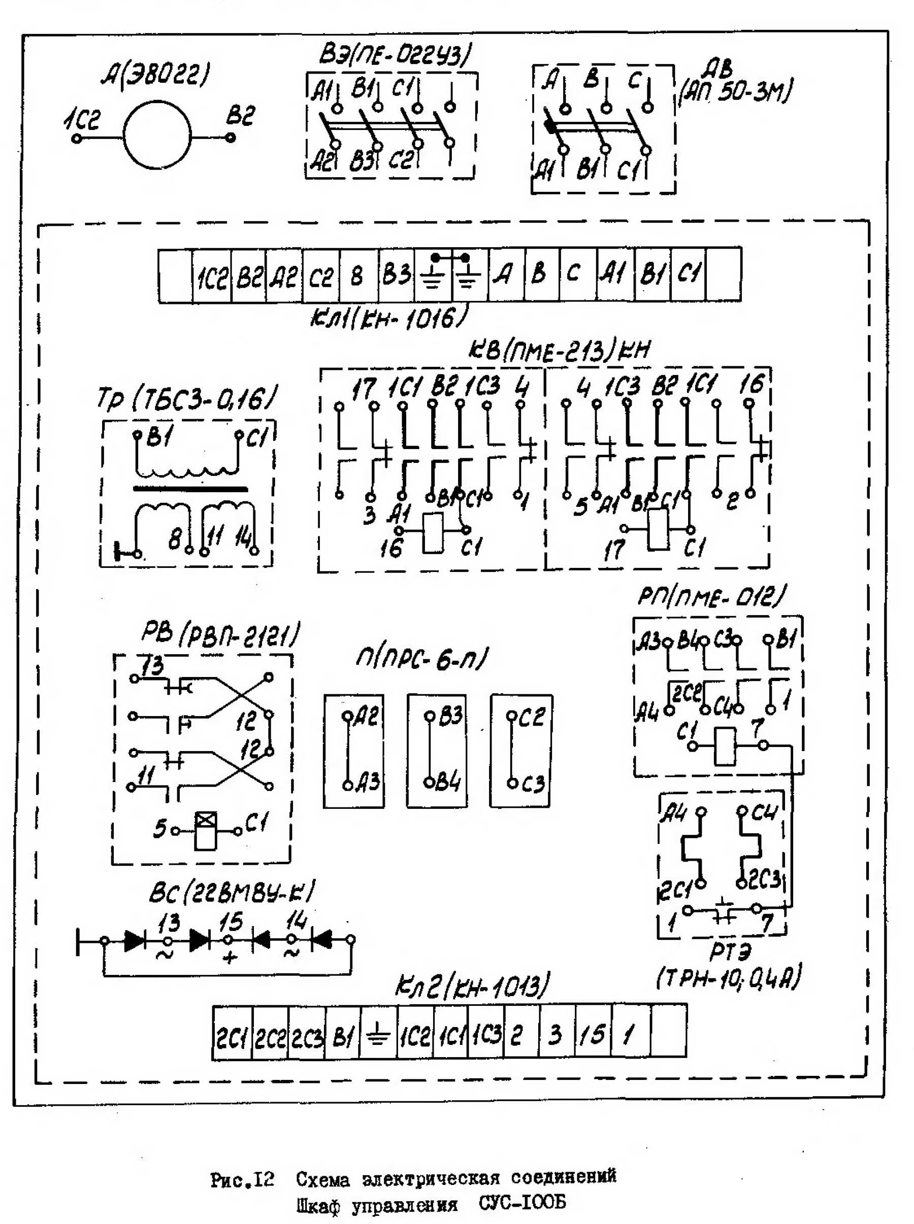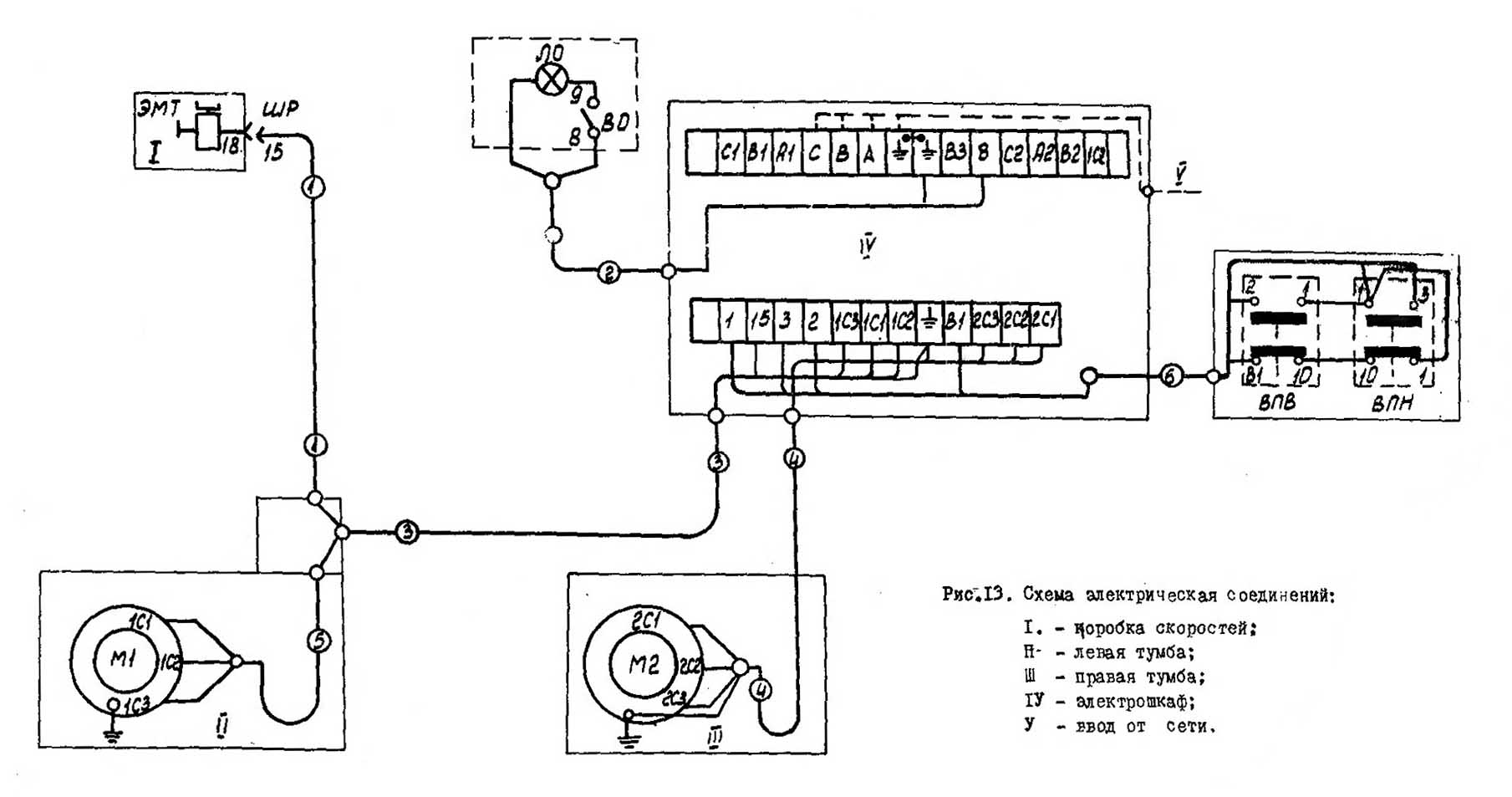 Пуск електродвигуна M1 в направлении "назад" производится переводом рукоятки 14 (см. рис. 3) в нижнее положение. Работа електросхеми аналогична работе при пуске електродвигуна М1 (см. рис. 11) в направлении "вперед", только в етом случае срабатывает контактор КН.