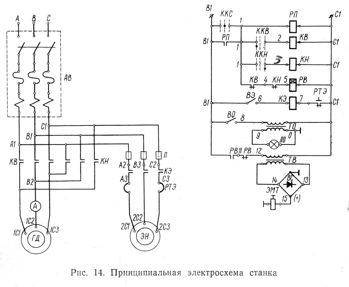 В електросхеме верстата предусмотрена защита от токов короткого замыкания електродвигуна головного приводу при помощи електромагнітних расланцюгителей автоматичного выключателя АВ і електронасоса охлаждения предохранителями П.