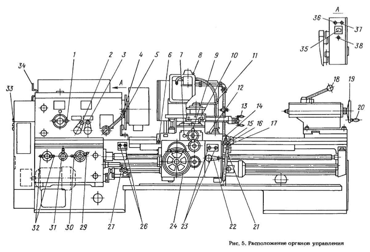 Розташування органів керування токарно-гвинторізним верстатом 1м63мф101